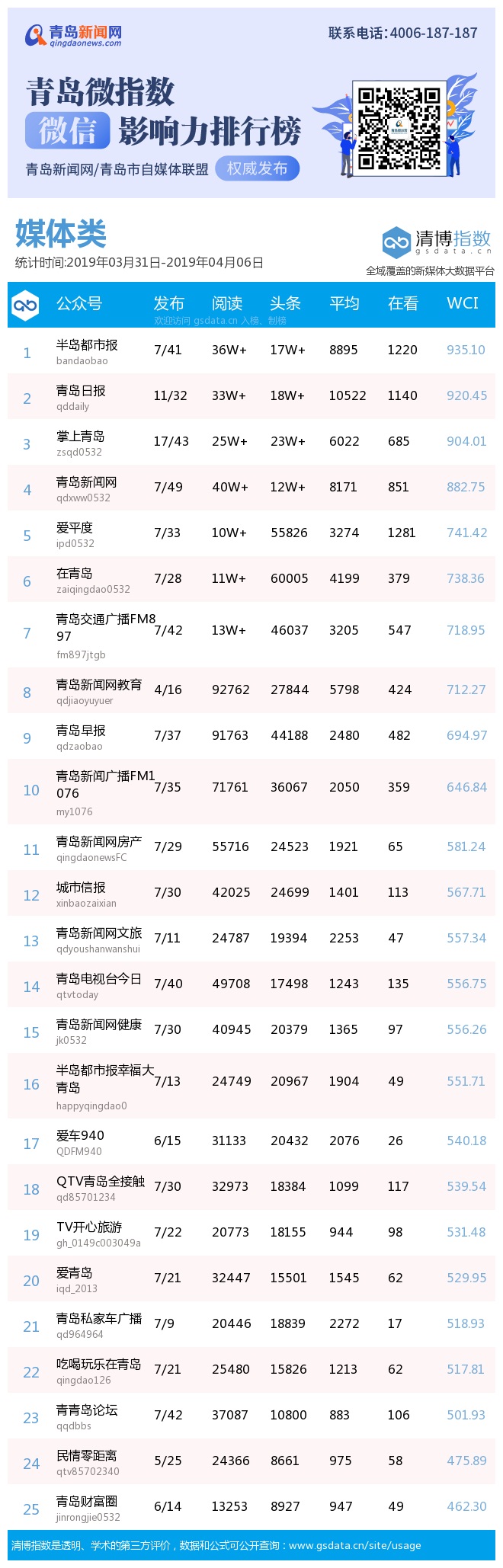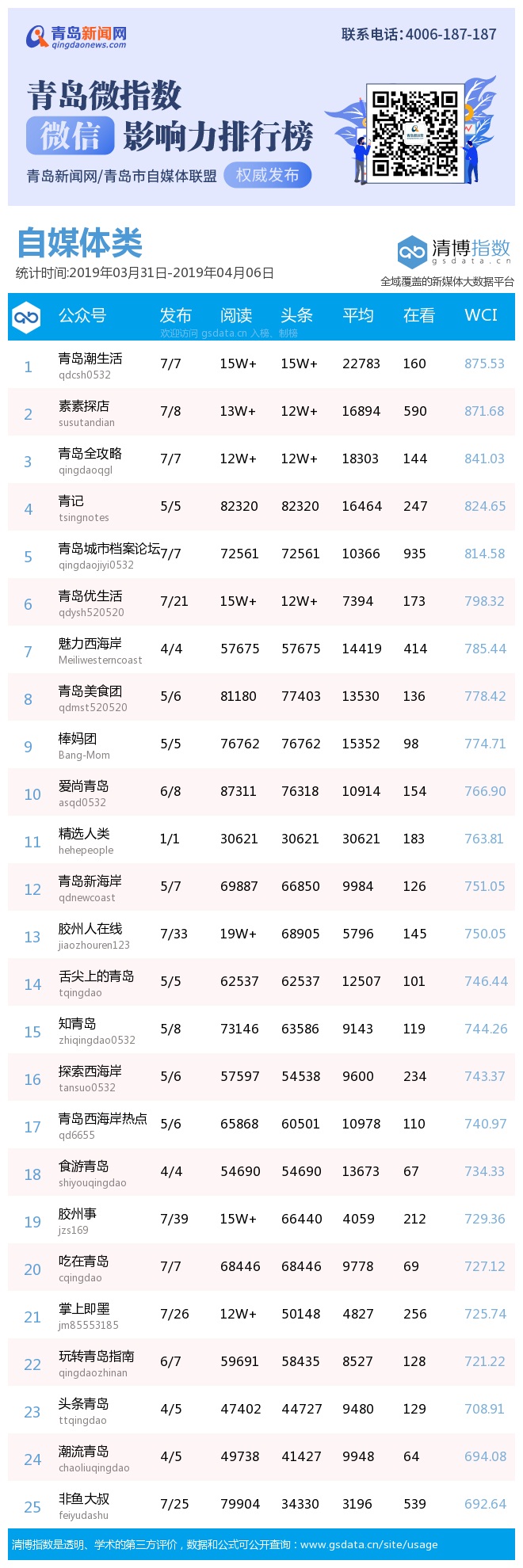 青島新聞網(wǎng)4月8日訊(記者 邢書(shū)玲)由青島新聞網(wǎng)、清博指數(shù)平臺(tái)聯(lián)手打造的“青島微指數(shù)微信影響力排行榜”今日發(fā)布一周(3月31日-4月6日)榜單。