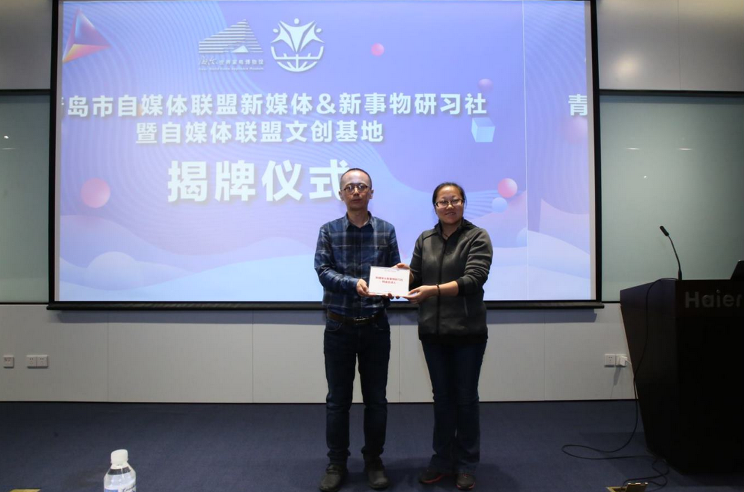 青島市自媒體聯(lián)盟為薛川頒發(fā)講師牌