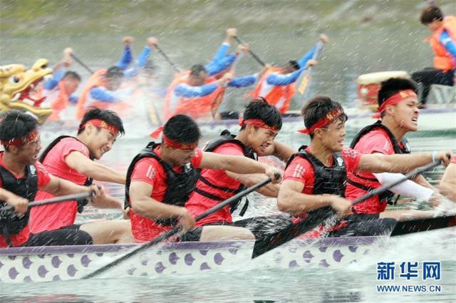 6月2日,人們?cè)诤鲜≠Y興市東江灣水上運(yùn)動(dòng)中心舉行的龍船賽中拼搏。新華社發(fā)(朱孝榮攝)
