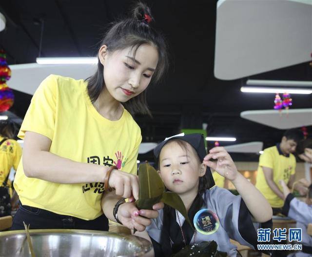 6月2日,在河北省廊坊市固安縣產(chǎn)業(yè)新城社區(qū)舉辦的迎端午主題活動(dòng)上,小朋友和家長(zhǎng)一起包粽子。新華社發(fā)(門叢碩攝)