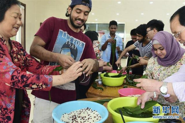 6月2日,在江蘇省鎮(zhèn)江市金江社區(qū),來自江蘇大學(xué)的留學(xué)生在體驗(yàn)包粽子。新華社發(fā)(石玉成攝)