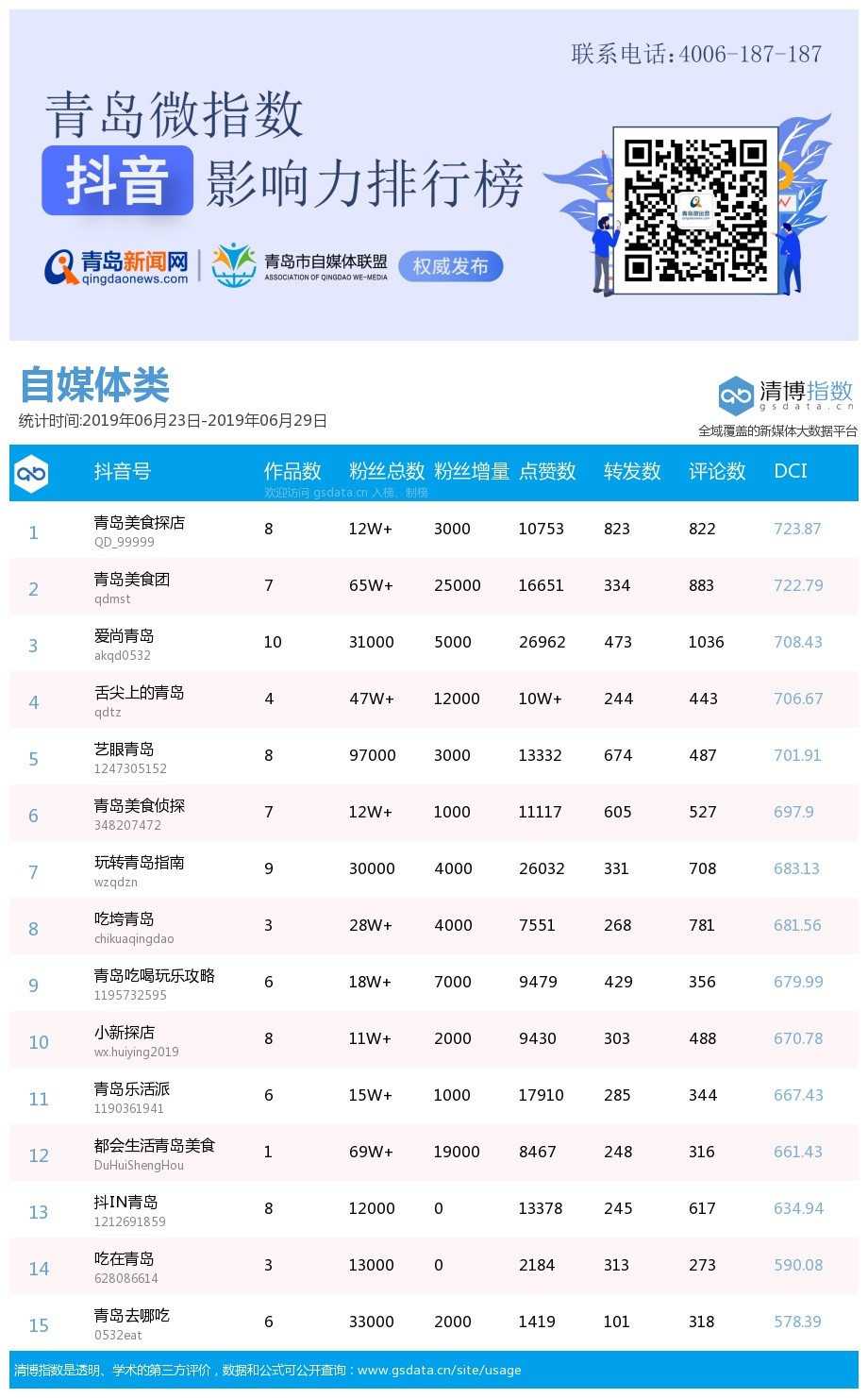 青島新聞網(wǎng)7月2日訊(記者 邢書(shū)玲)由青島新聞網(wǎng)、清博指數(shù)平臺(tái)聯(lián)手打造的“青島微指數(shù)抖音影響力排行榜”今日發(fā)布一周(6月23日-6月29日)榜單。