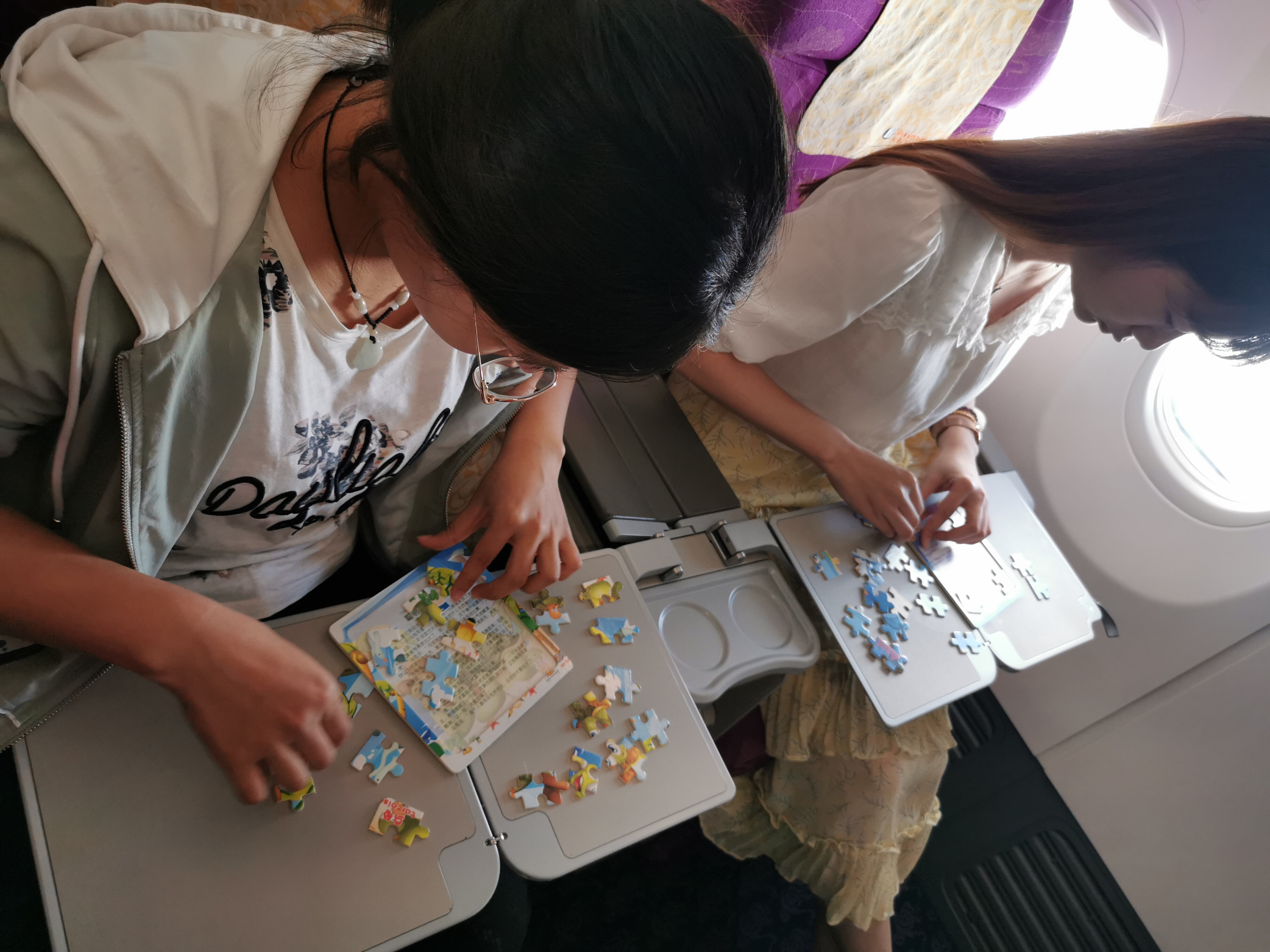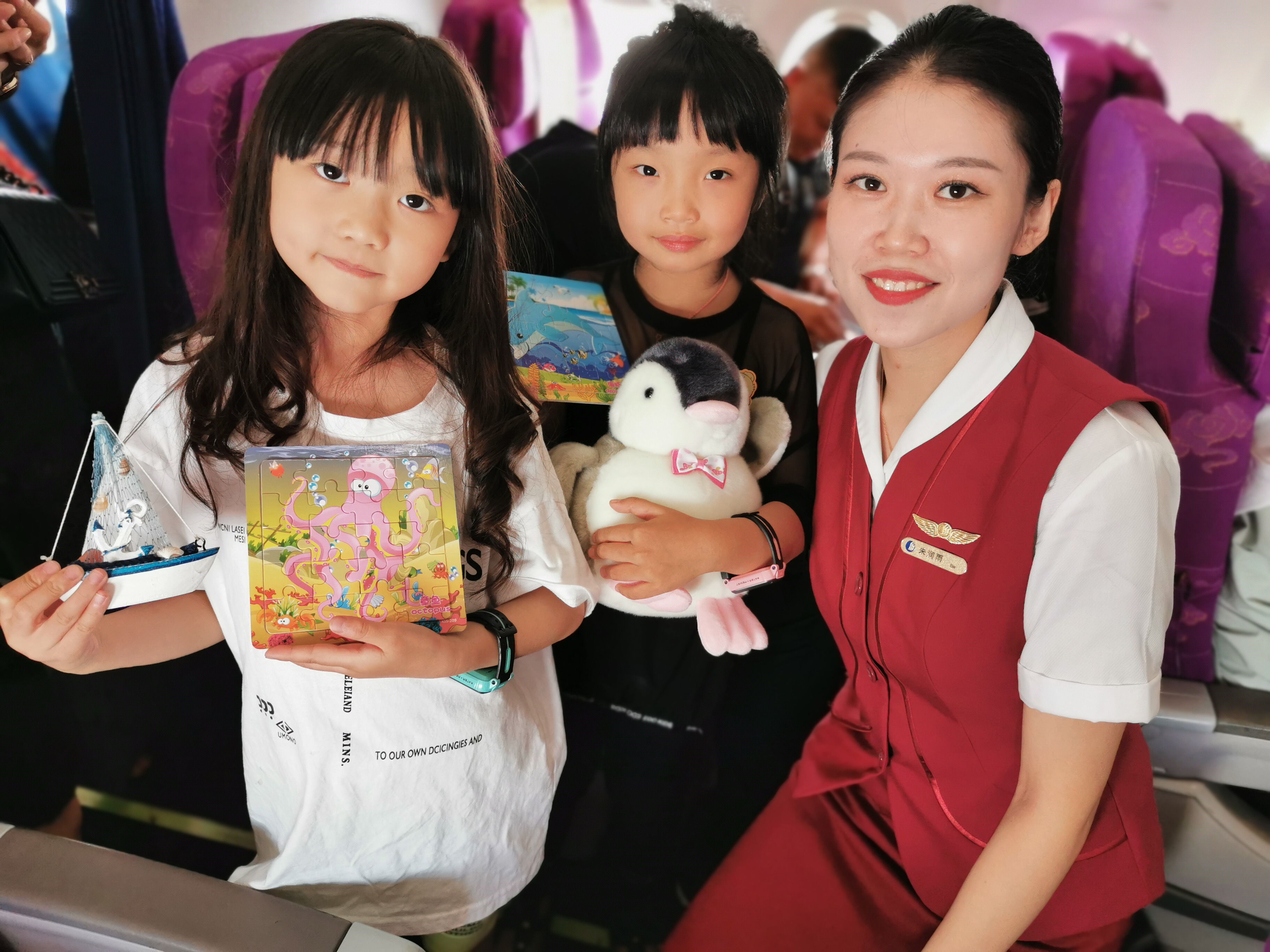 “今天是中國航海日,第一個游戲為海洋主題眼力手力大比拼!”乘務(wù)員邀請了六位乘客,并把他們分成兩組進(jìn)行一對一海洋拼圖比賽。隨著乘務(wù)員一聲令下,比賽開始,時間一秒一秒的過去。“我拼完了!”一名乘客僅用時1分鐘就將拼圖拼完。獲得第一名的乘客收到了乘務(wù)員送上的山航飛機(jī)模型,其他人則獲得了小帆船禮品。接下來,進(jìn)行了海洋知識問答,乘務(wù)員從踴躍參與的乘客中選出4人參與問答。“在海洋的各種污染物中,對海洋的破壞最嚴(yán)重、最普遍的是……”在乘客緊鎖眉頭的思考中,海洋知識問答活動結(jié)束。參與問答的乘客依次獲得了乘務(wù)員送出的海洋動物毛絨玩具。