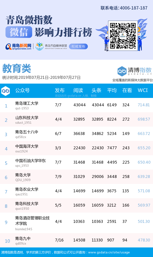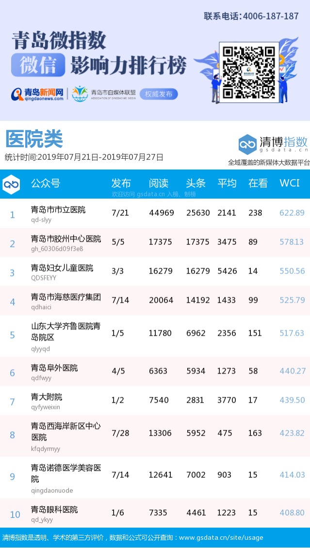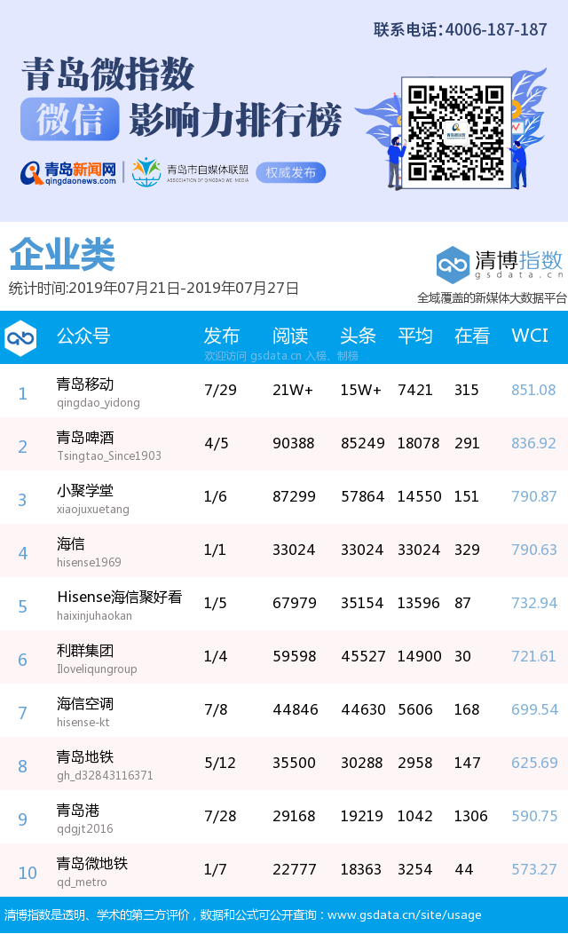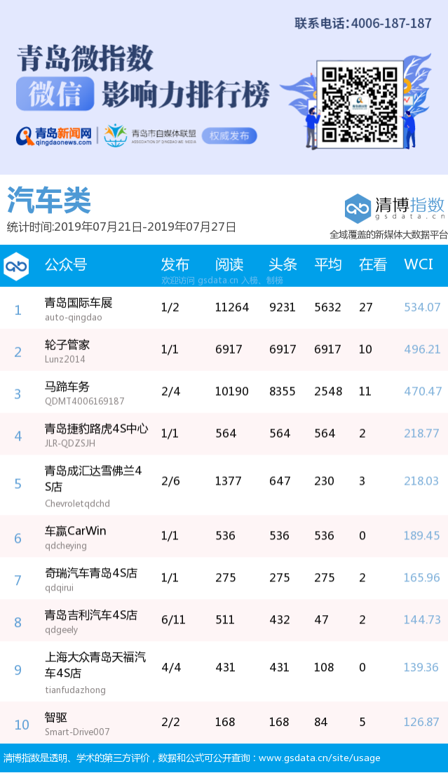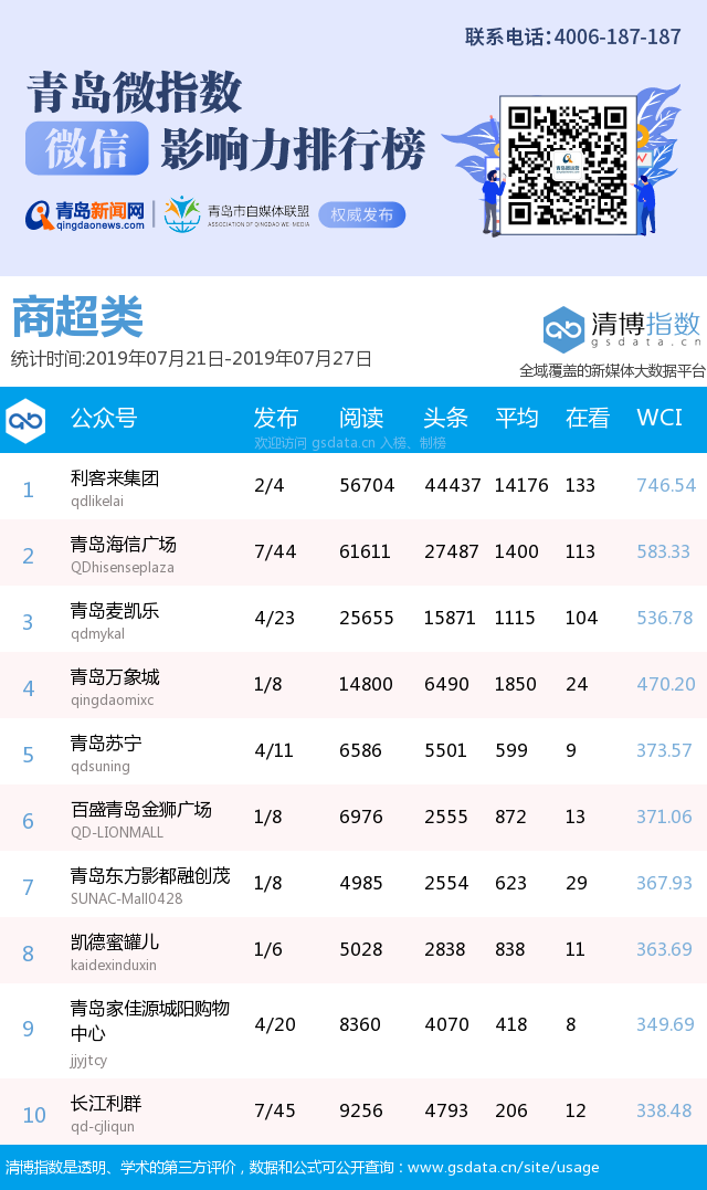 3、本次榜單收錄了青島14個(gè)行業(yè)微信公眾號(hào),如您的賬號(hào)暫未收錄,可聯(lián)系4006-187-187。