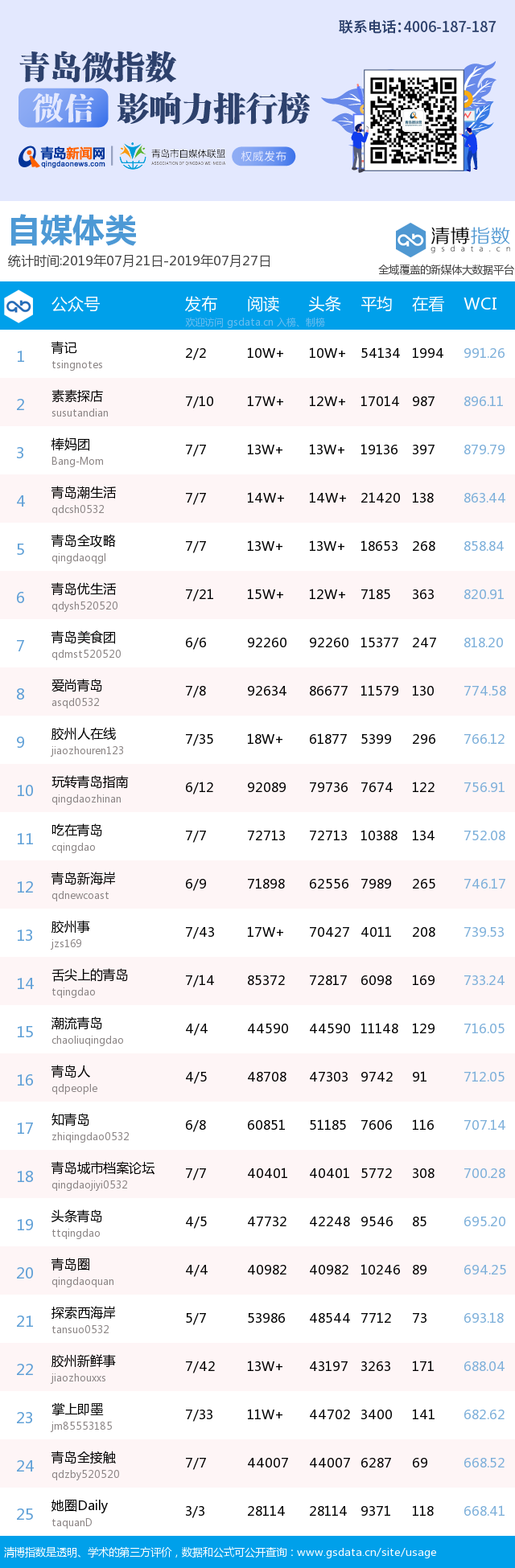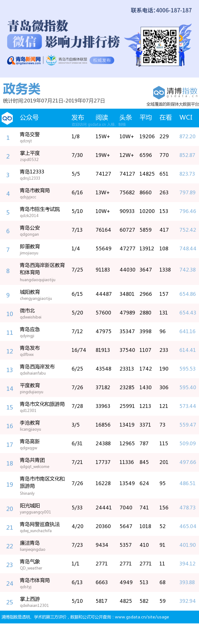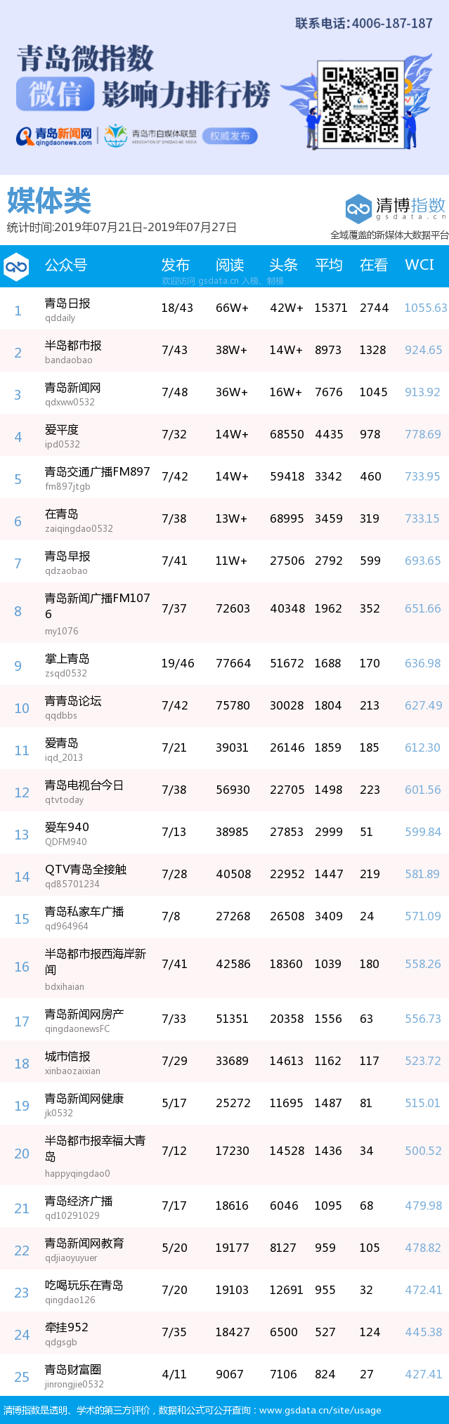 青島新聞網(wǎng)7月29日訊(記者 邢書玲)由青島新聞網(wǎng)、清博指數(shù)平臺(tái)聯(lián)手打造的“青島微指數(shù)微信影響力排行榜”今日發(fā)布一周(7月21日-7月27日)榜單。