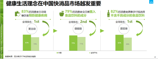 “收入水平的提升成為了驅(qū)使人們追逐品質(zhì)生活的根源”?!秷蟾妗凤@示,在消費理念上,健康生活的理念在中國快消飲料市場倍受推崇。與全球消費者相比,83%的中國消費者會主動調(diào)整飲食以預(yù)防健康疾病,高出全球平均13個百分點,他們對健康食品和飲料也更為重視,更有消費意愿。尼爾森數(shù)據(jù)顯示,79%的消費者會注意攝入食品和飲料的成分,82%的消費者愿意多付錢選擇安全成分的食品和飲料,而全球平均值僅為68%。