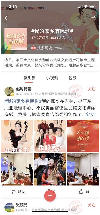 今日頭條與旦增尼瑪、阿蘭、扎西頓珠、降央卓瑪、阿幼朵等少數(shù)民族歌唱家合作,邀請明星、達(dá)人和優(yōu)質(zhì)創(chuàng)作者參與話題,在歷史、國風(fēng)等多個頻道發(fā)起討論。頭條站內(nèi)話題“我的家鄉(xiāng)有民歌”,推出兩天,共有近2000用戶參與討論,超4500萬閱讀。作家蘇岑回憶少年時合唱山東民歌《誰不說俺家鄉(xiāng)好》,“柔婉流麗,娓娓而訴”,引起頭條用戶共鳴。西瓜視頻、火山小視頻也各自上線了相關(guān)話題。