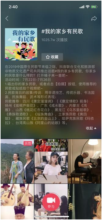 像覃誠芳這樣的民歌愛好者在抖音上還有很多。全國各地的民歌也通過抖音獲得了更廣更遠(yuǎn)的傳播。據(jù)不完全統(tǒng)計,抖音上共有102萬個國家級非遺民歌短視頻,產(chǎn)生了37億播放,獲得1.24億點贊。