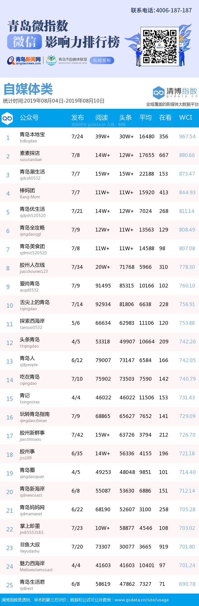 3、本次榜單收錄了青島14個(gè)行業(yè)微信公眾號(hào),如您的賬號(hào)暫未收錄,可聯(lián)系4006-187-187。