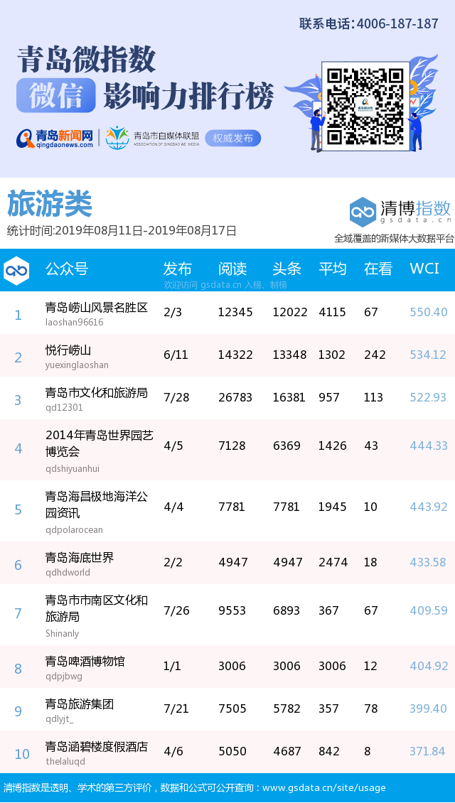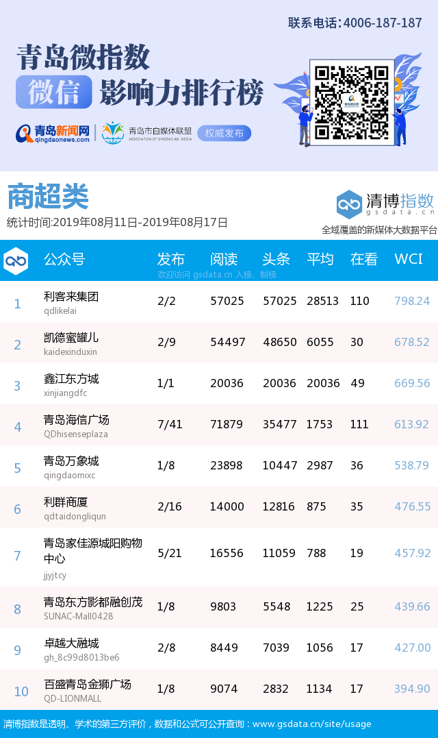 3、本次榜單收錄了青島14個(gè)行業(yè)微信公眾號(hào),如您的賬號(hào)暫未收錄,可聯(lián)系4006-187-187。
