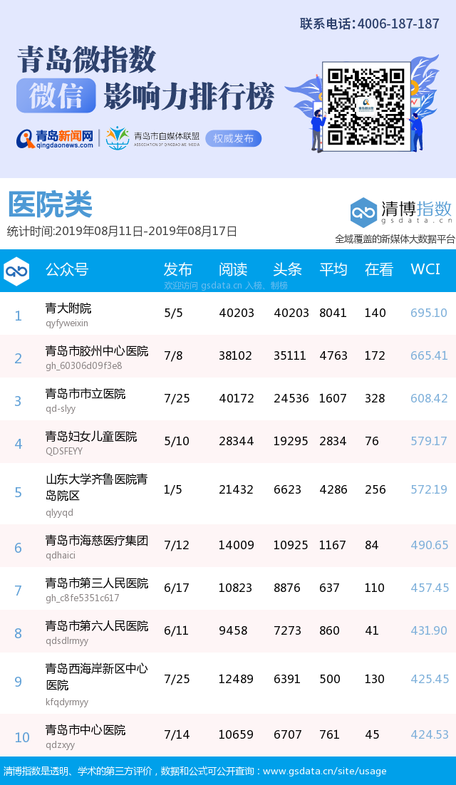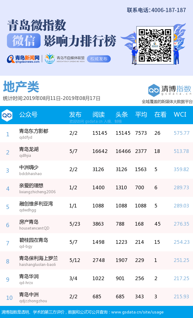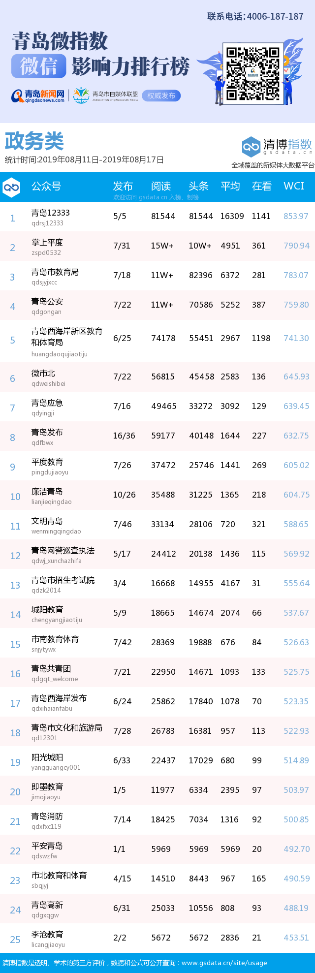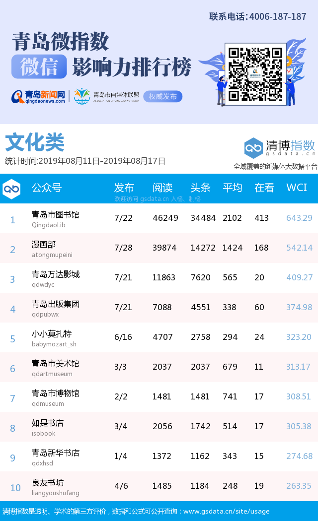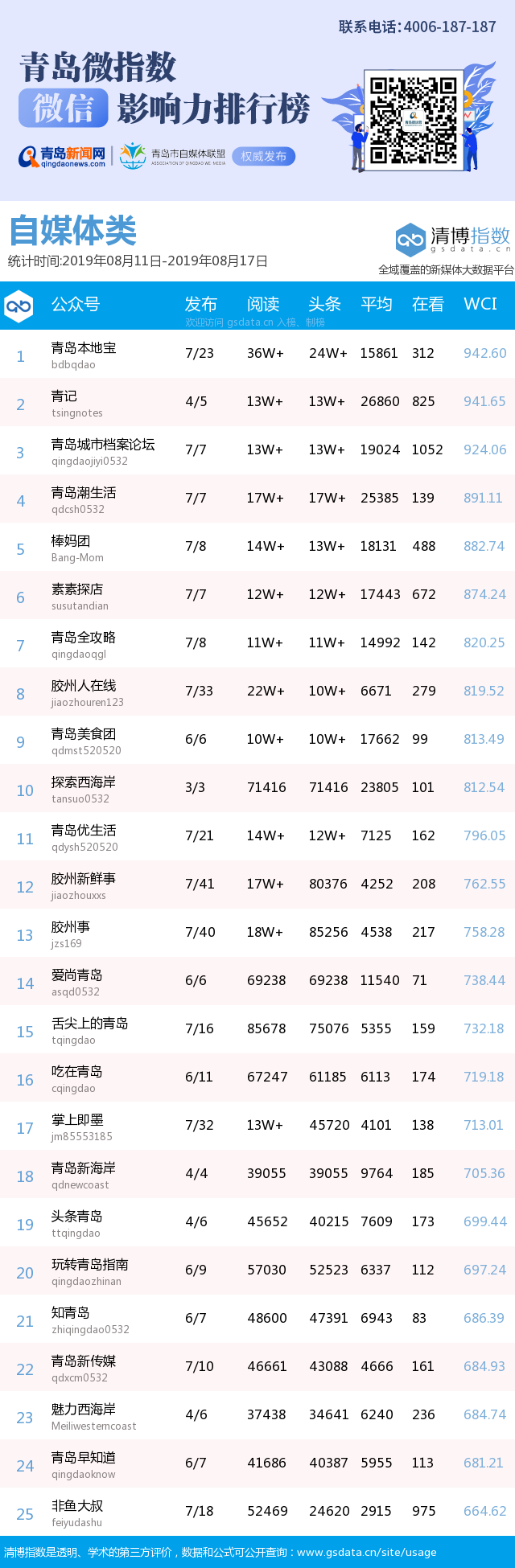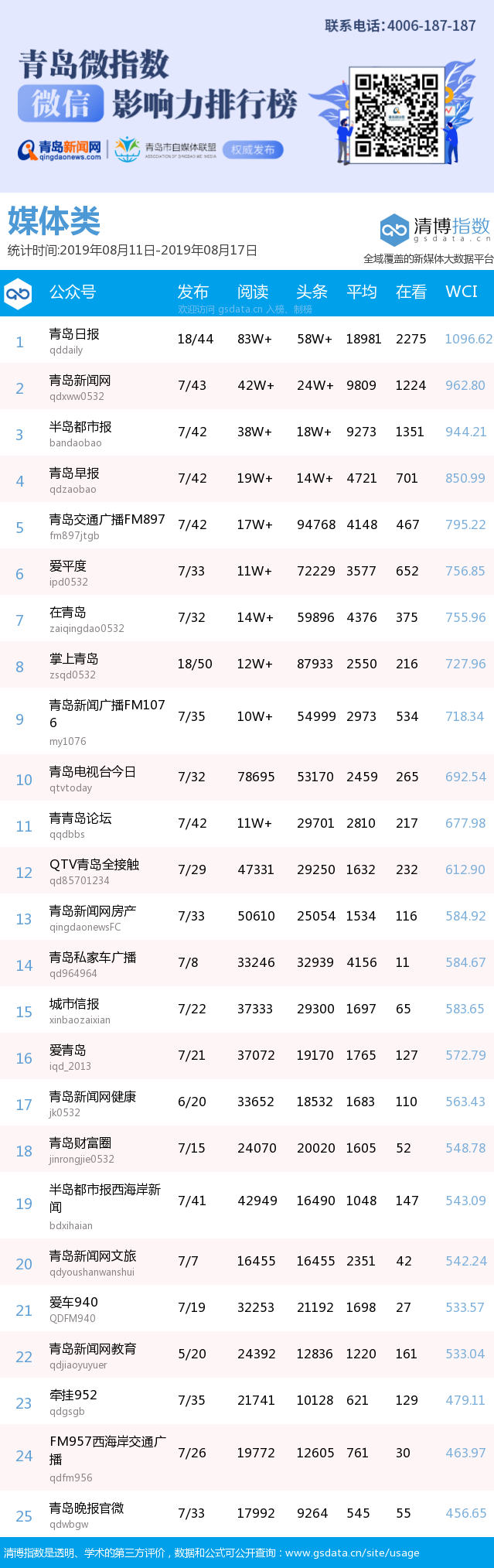 青島新聞網(wǎng)8月19日訊(記者 邢書(shū)玲)由青島新聞網(wǎng)、清博指數(shù)平臺(tái)聯(lián)手打造的“青島微指數(shù)微信影響力排行榜”今日發(fā)布一周(8月11日-8月17日)榜單。