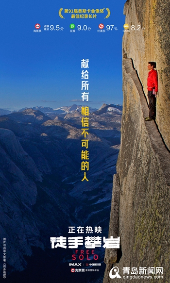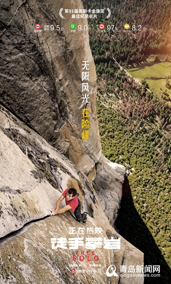 青島新聞網(wǎng)9月6日訊(記者 張力偉) 第91屆奧斯卡金像獎獲獎佳作《徒手攀巖》今日震撼上映,此前影片未映口碑先火,以其獨特的題材和超強的視覺體驗獲得了觀眾的一致好評,淘票票點映開分9.5分,豆瓣超五萬人打出9.0高分,?!锻绞峙蕩r》完整記錄了“世界徒手攀巖大師”亞歷克斯·霍諾德采用無保護、單人徒手(Free Solo)的方式,登頂美國約塞米蒂國家公園高達3000英尺的酋長巖的完整歷程,這是人類歷史上首次以毫無保護的方式登頂酋長巖。亞歷克斯對熱愛之事的極致追求和孤膽向上的勇士精神震撼感染了每一位觀眾,也讓影片成為2019年最受期待的影片之一。