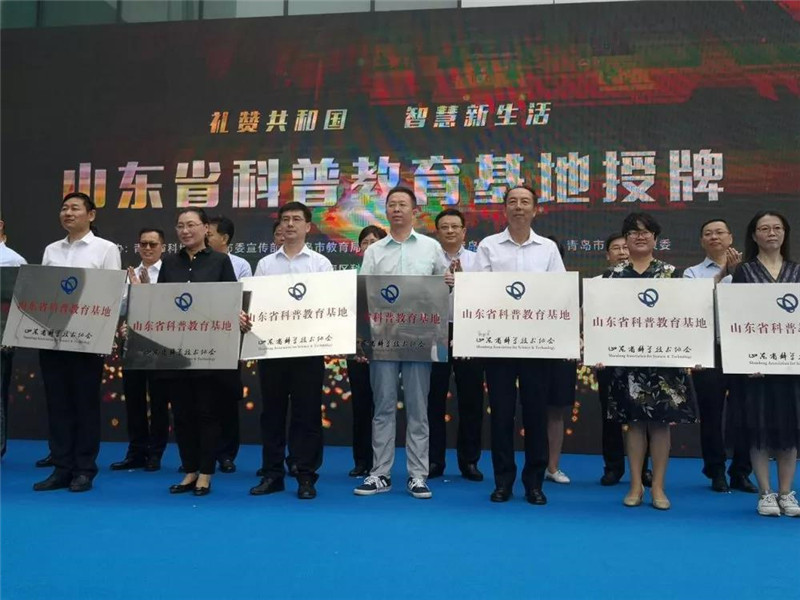 青島市領(lǐng)導(dǎo)為榮獲“省級科普基地”單位代表授牌、前排左三為市中心血站站長逄淑濤