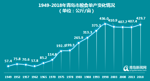 1958年至1962年期間,由于連續(xù)3年自然災(zāi)害影響,以及急于求成的“大躍進(jìn)”“人民公社”化等農(nóng)業(yè)生產(chǎn)體制的失誤,糧食產(chǎn)量不增反降。1962年青島糧食總產(chǎn)量僅62.89萬噸,比1957年減少29.3萬噸,天災(zāi)人禍導(dǎo)致國民長期受溫飽問題困擾;此后,由于中央貫徹“調(diào)整、整頓、充實(shí)、提高”的八字方針,產(chǎn)量開始回升,到1965年產(chǎn)量恢復(fù)到接近1957年的水平;到1975年,青島市糧食單產(chǎn)達(dá)到192.34公斤/畝,比1957年單產(chǎn)提高了121.75公斤/畝,年均增長6%,糧食總產(chǎn)量達(dá)到189.95萬噸,增長了97.76萬噸,翻了一番多。