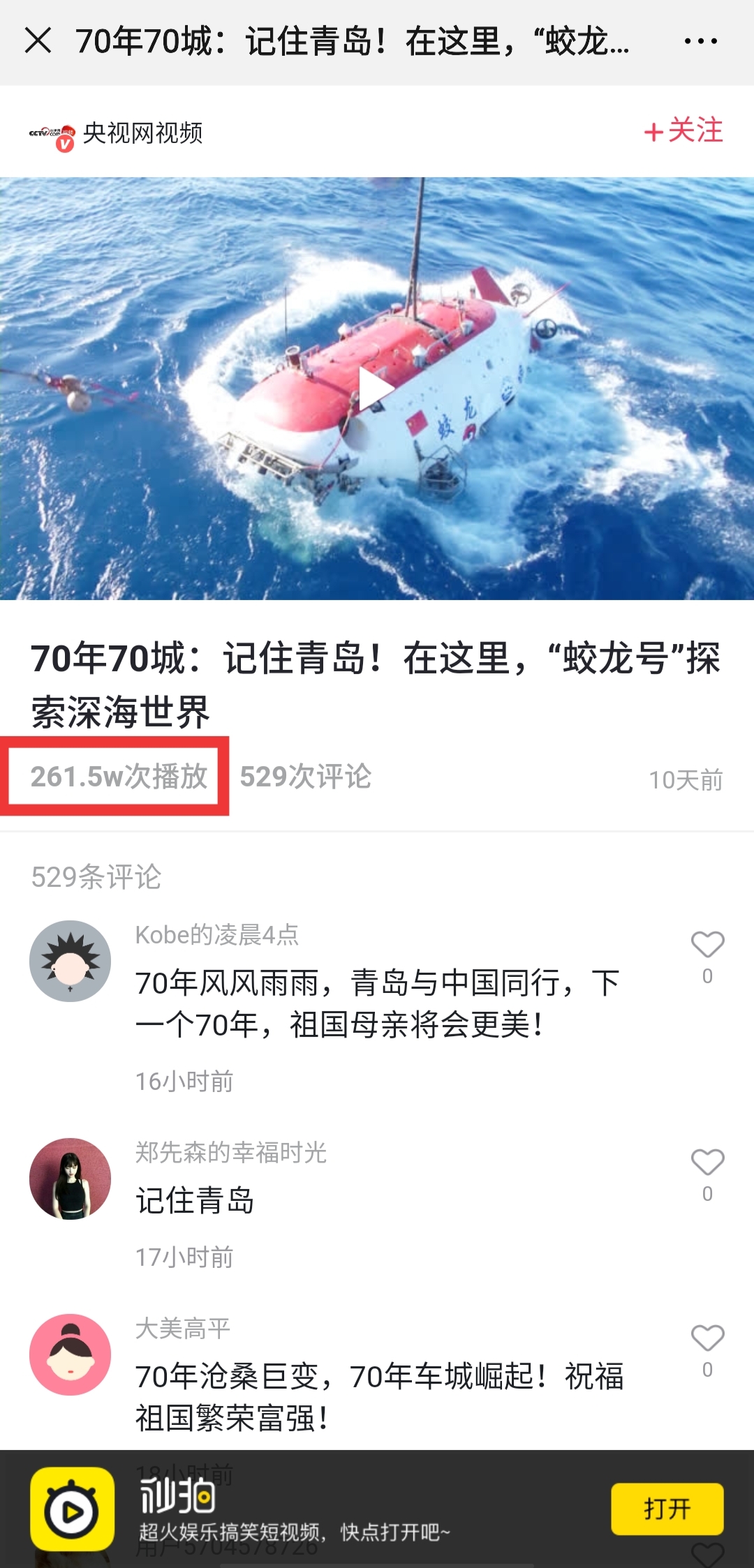9月15日,【70年70城】青島篇正式上線,并迅速在新浪、騰訊、今日頭條、鳳凰、網(wǎng)易、百度等平臺傳播開來,截止到9月18日下午15:00,央視網(wǎng)發(fā)布的“【70年70城】 #記住青島!在這里,‘蛟龍?zhí)枴剿魃詈J澜纭眱?nèi)容,在秒拍視頻收獲261.5萬+播放,騰訊視頻收獲1648.1萬+播放。