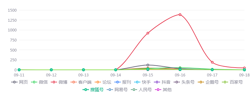 通過事件走勢圖我們可以看到,從9月15日開始,關(guān)于“【70年70城】記住青島”的信息開始發(fā)酵,16日到達(dá)最大峰值。其中微博輿情信息熱度波動最大,在09月16日達(dá)到波峰,09月15日達(dá)到次波峰。網(wǎng)頁、微信、客戶端、論壇、報刊、快手、抖音、頭條號、企鵝號、百家號、搜狐號、網(wǎng)易號、人民號、其他的輿情信息熱度小于微博平臺??梢哉f在此處傳播中,微博發(fā)揮了主力軍作用。