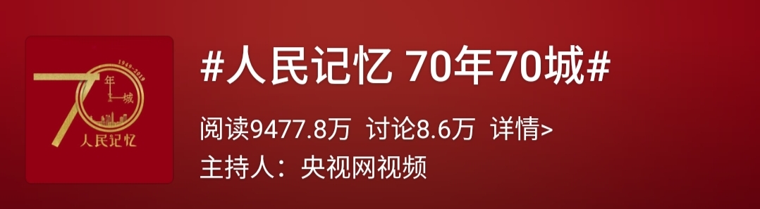 在慶祝中華人民共和國成立70周年到來之際,央視網(wǎng)推出了【人民記憶 70年70城】系列視頻,引發(fā)了全網(wǎng)關(guān)注,截至目前,#人民記憶 70年70城#微博超話,閱讀達(dá)9477.8萬,討論8.6萬。