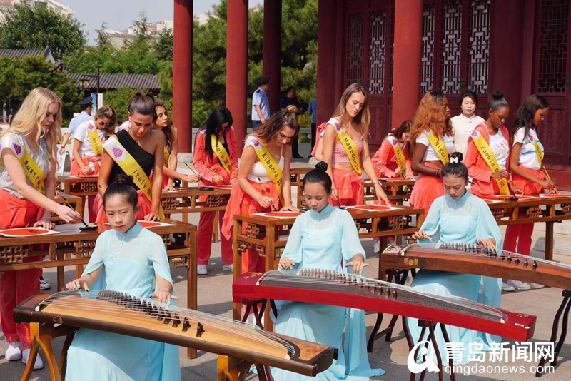 優(yōu)雅的古箏表演,用優(yōu)雅華麗的演奏深深博得了佳麗們的熱烈掌聲。在箏樂的伴奏中,城陽的書法老師帶領(lǐng)著佳麗們一筆一劃地用毛筆書寫祝福,在翰墨之間感悟東方文化意蘊。