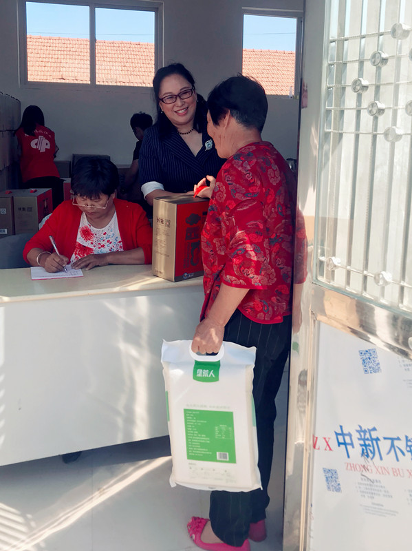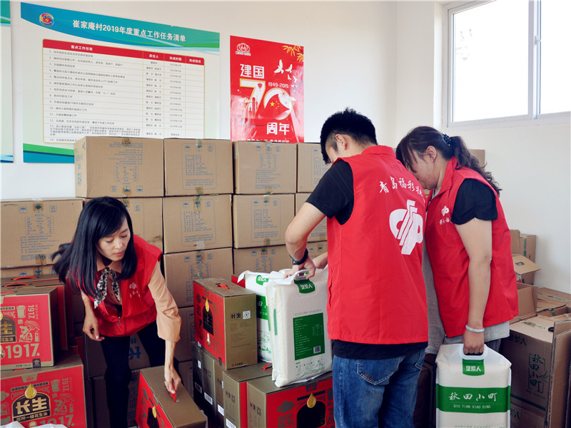 青島市福利彩票發(fā)行中心的社工及志愿者為村里60歲以上老人送上大米、花生油等生活物資。