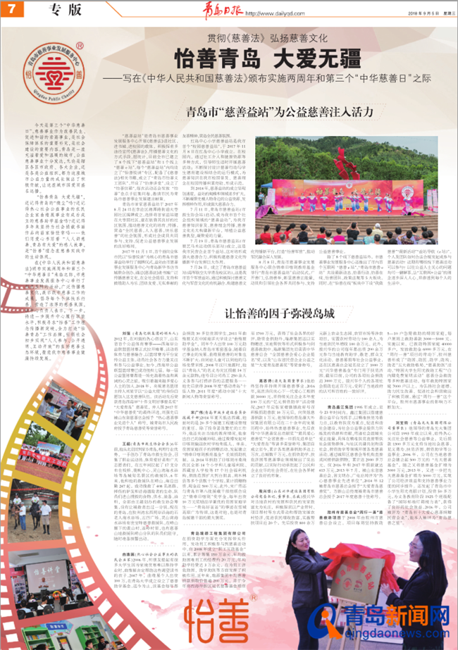 在 《中華人民共和國(guó)慈善法 》頒布實(shí)施兩周年和第三個(gè)“中華慈善日”來(lái)臨之際,市慈善事業(yè)發(fā)展服務(wù)中心舉行了形式多樣的活動(dòng),廣泛傳播慈善文化,展示我市慈善工作的成果,倡導(dǎo)每個(gè)個(gè)體快樂(lè)行善,營(yíng)造了濃厚的慈善氛圍。該中心負(fù)責(zé)人表示,下一步,將進(jìn)一步提升中心履行職能水平,積極尋求“怡善”工作理念傳播新突破,全力打造“怡善青島”工作品牌,引領(lǐng)社會(huì)初步實(shí)現(xiàn)“人人參與、公開(kāi)透明、互動(dòng)開(kāi)放”的良好慈善生態(tài)環(huán)境,推進(jìn)我市慈善事業(yè)健康持續(xù)發(fā)展。
