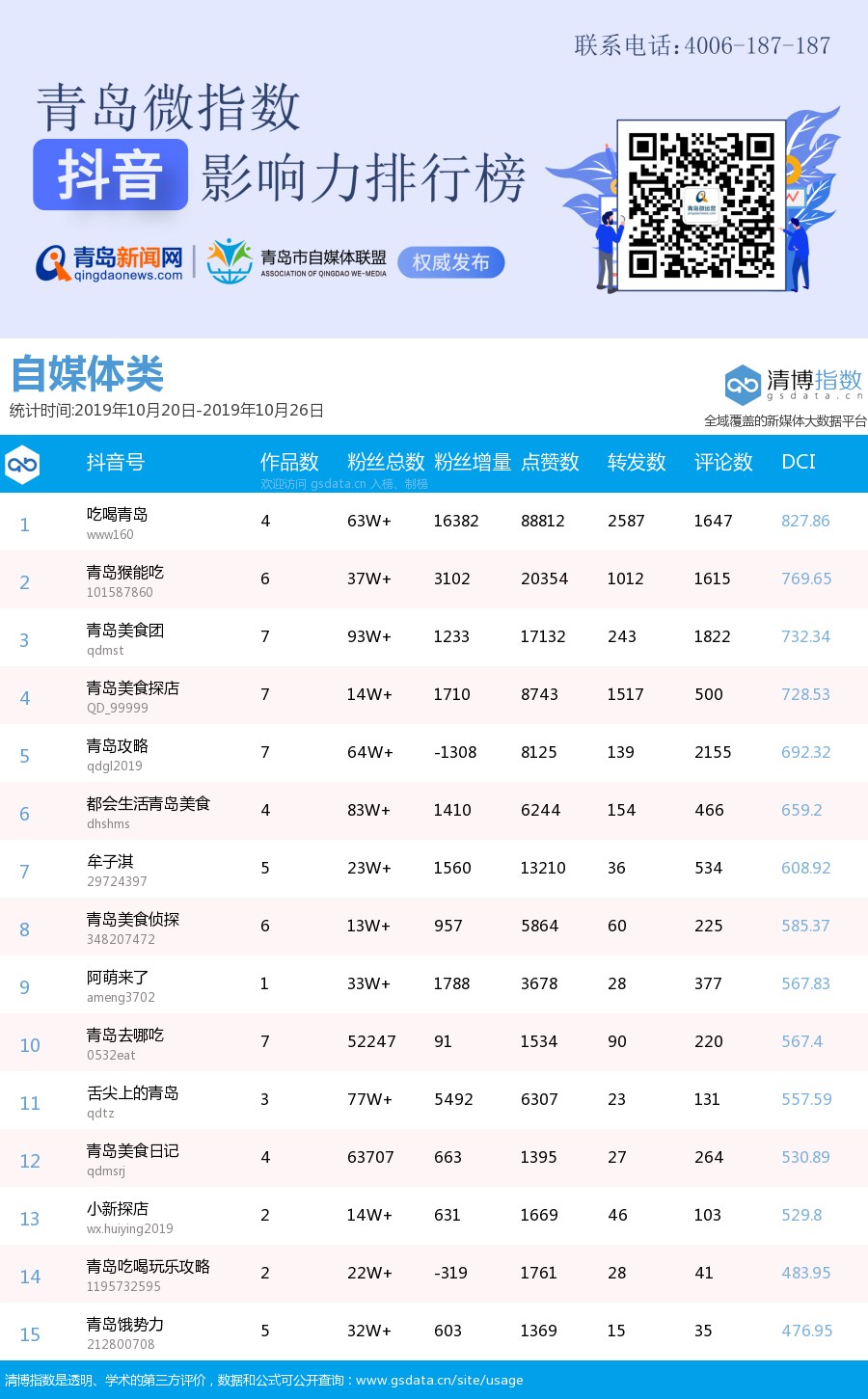 【抖音】青島微指數(shù)抖音影響力排行榜(10月20日-10月26日)
