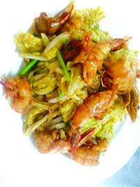 大蝦沿背部剖開,挑去蝦線。白菜頭撕成大塊。鍋內(nèi)放油,放蔥、姜爆香,放入大蝦,調(diào)入料酒,用小火慢慢煸炒出蝦油。加入白菜小火炒熟,下鹽調(diào)味即可。