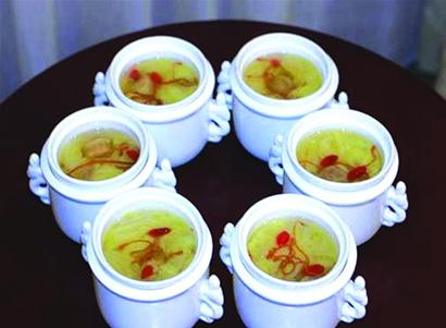 這道菜是青島的特色菜品,也是選用清澈的雞湯配上干的扇貝柱和白菜制作而成。為了菜品的營養(yǎng)和感官,加了蟲草花和枸杞。這些原材料在市場都很容易買到。膠州賓館的鮑魚房主管石樹家介紹,瑤柱用溫水泡半小時(shí),蟲草花、枸杞洗凈。大白菜葉去幫撕成片。白菜葉焯水過涼攥干水,分入盅里。把泡好的瑤柱蟲草花枸杞放在白菜上。清雞湯調(diào)好味加在盅里。放入籠屜蒸1小時(shí)即可。