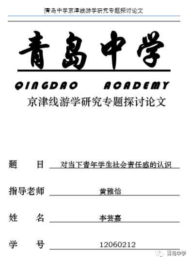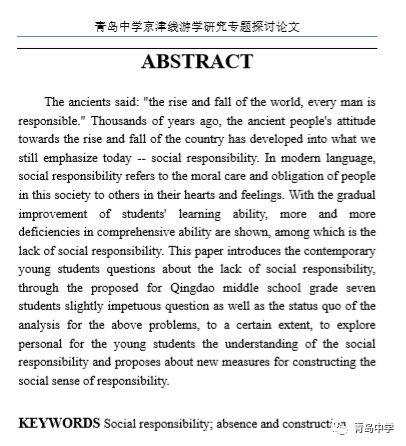 而在京津人文線研學(xué)中,初中部學(xué)生李蕓嘉則撰寫了相當(dāng)規(guī)范的研學(xué)論文。在她的《對當(dāng)下青年學(xué)生社會責(zé)任感的認(rèn)識》論文中,不但有完整豐富的論據(jù)和素材,中英文摘要及參考目錄等標(biāo)準(zhǔn)論文格式也一應(yīng)俱全。