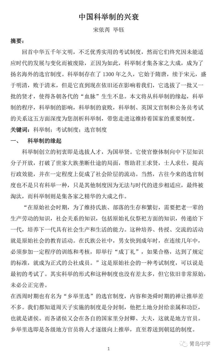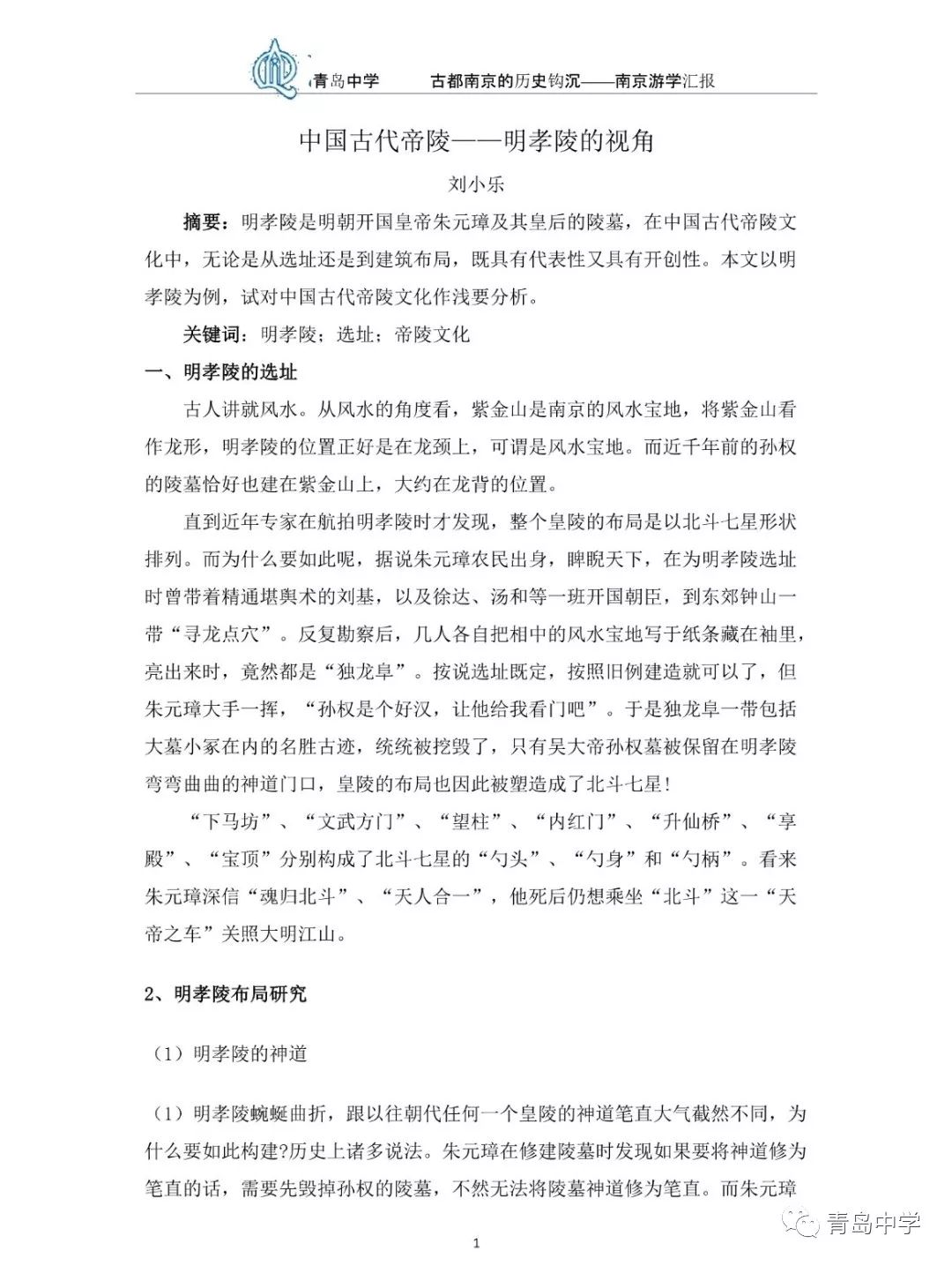 初中部學(xué)生趙子健在南京研學(xué)后,選取“南京總統(tǒng)府”這一研學(xué)地標(biāo)作為研究對象,通過小論文的形式充分展示了其文化內(nèi)涵,從“總統(tǒng)制在中國的誕生與發(fā)展”、“南京總統(tǒng)府的權(quán)力運轉(zhuǎn)”“總統(tǒng)府的前世今生”等論點進行了論述與思考。同一行程中,初中部學(xué)生宋依芮則以科舉博物館為基礎(chǔ),分別通過“古代科舉制的緣起、程序、影響、廢除、科舉制與英國文官制及公務(wù)員考試的關(guān)系”等論點,探討了“中國科舉制的興衰”。