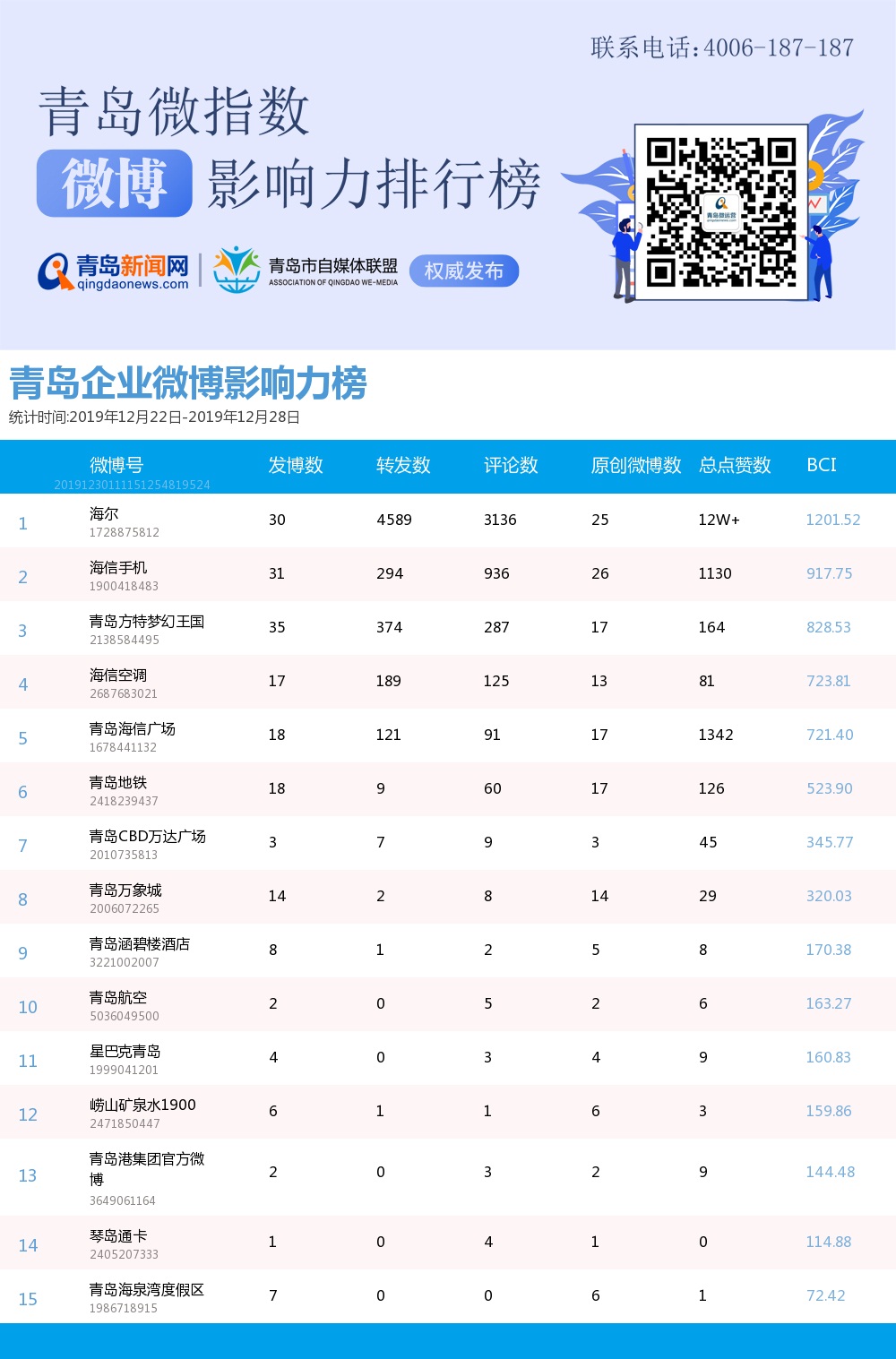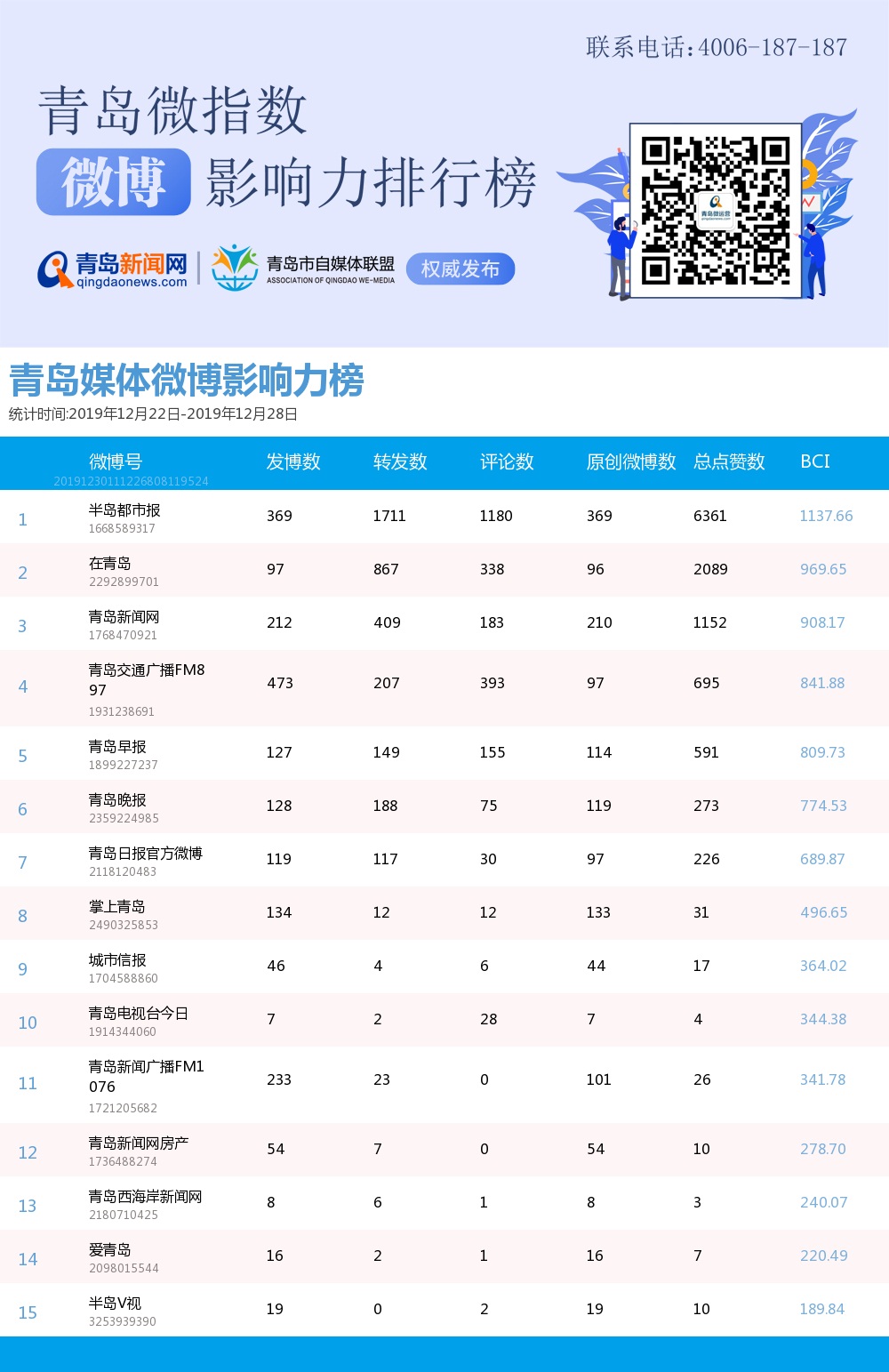 青島新聞網(wǎng)12月30日訊(記者 邢書玲)由青島新聞網(wǎng)、清博指數(shù)平臺聯(lián)手打造的“青島微指數(shù)微博影響力排行榜”今日發(fā)布一周(12月22日-12月28日)榜單。