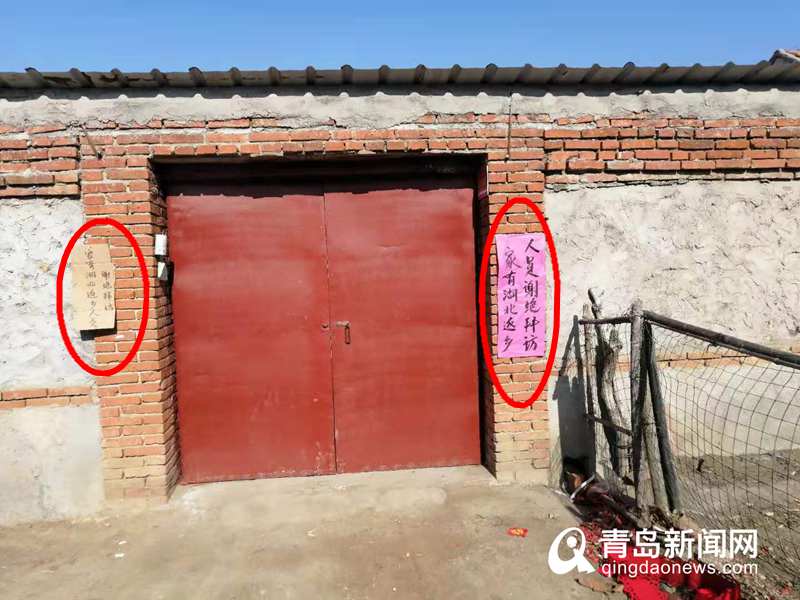 萊西市夏格莊鎮(zhèn)從湖北返鄉(xiāng)探親人員居家自我隔離在門(mén)口貼出告示。