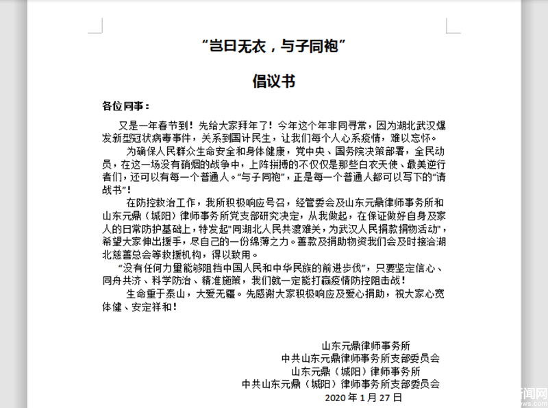 “緣起于武漢、席卷全國的重大疫情,時刻牽動著我們?nèi)w律師的心,抗疫一線的困難我們感同身受,眾人拾柴火焰高,我們愿鼎力相助,為早日取得防疫的最后勝利獻(xiàn)上自己的力量!”面對疫情,山東元鼎(城陽)律師事務(wù)所及黨支部第一時間發(fā)出了“豈曰無衣、與子同袍——同湖北人民共渡難關(guān)、為武漢人民捐款捐物”活動,短短一天,就募集善款24066元,并迅速匯往武漢用于疫情防控及救治。