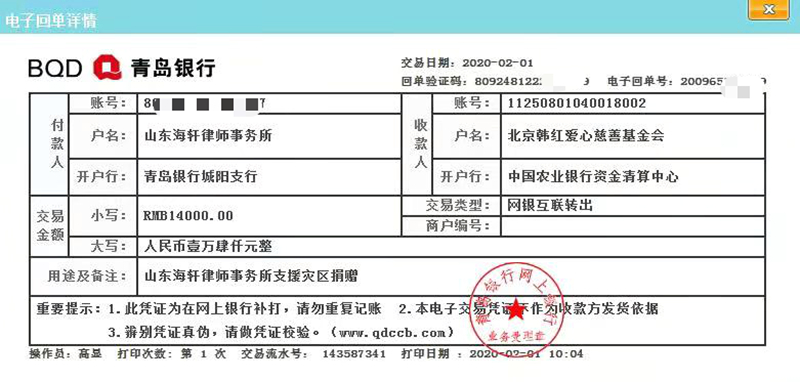 青島新聞網(wǎng)2月2日訊(記者 任俊峰 通訊員 茍小妹)“任何力量都不可能壓彎中華民族的脊梁,萬眾一心,同舟共濟(jì),我們要用愛筑起“心”的長城,用愛加持前線英雄,用愛撫慰受災(zāi)同胞,用愛團(tuán)結(jié)一切力量,律所愿盡綿薄之力,共克時艱,打贏這場疫情防控阻擊戰(zhàn)。”山東納源律師事務(wù)所主任楊財基告訴記者,疫情發(fā)生后,納源律師事務(wù)所迅速行動,組織全所律師、員工捐款,截止1月31日,共捐款2400元,用于防控和抗擊武漢新型冠狀病毒疫情。