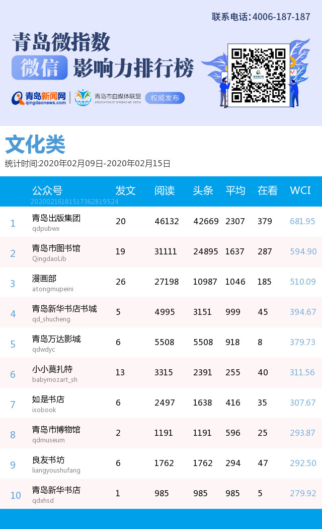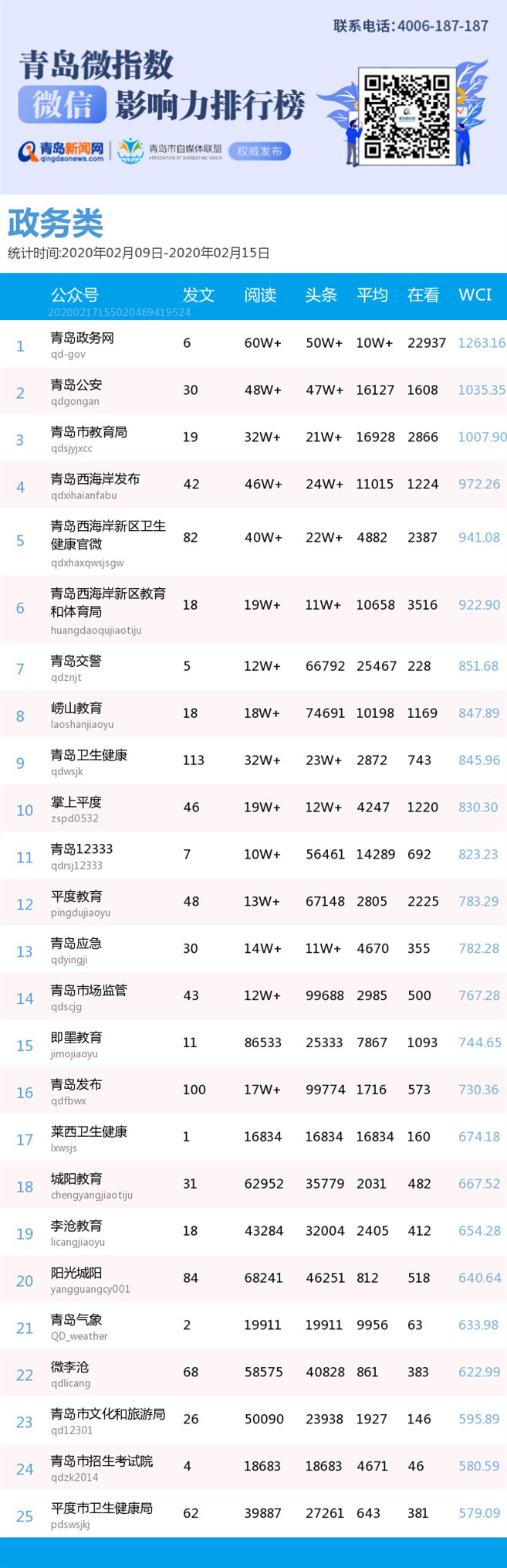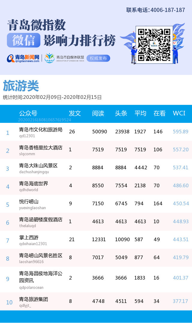 3、本次榜單收錄了青島14個行業(yè)微信公眾號,如您的賬號暫未收錄,可聯(lián)系4006-187-187。
