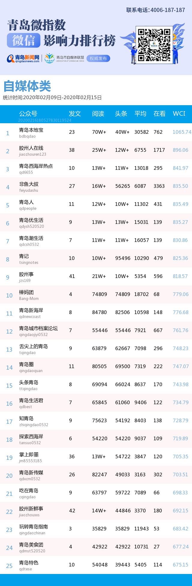 青島新聞網(wǎng)2月17日訊(記者 邢書玲)由青島新聞網(wǎng)打造的“青島微指數(shù)微信影響力排行榜”今日發(fā)布一周(2020年2月9日-2020年2月15日)榜單。