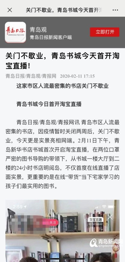 書城暫停營(yíng)業(yè)期間,廣泛宣傳線上服務(wù)方式。一是發(fā)動(dòng)職工,在朋友圈、微信群、家長(zhǎng)群等發(fā)布書城線上店鋪的營(yíng)業(yè)消息。二是積極與市南文旅局、珠海路街道辦事處、愛青島客戶端等平臺(tái)對(duì)接,宣傳書城線上服務(wù)方式,讓更多人了解書城官方店鋪。2020年2月5日,與市南文旅局、愛情島聯(lián)合推出“相信閱讀的力量”書單,進(jìn)一步擴(kuò)大覆蓋面。2020年2月11日,青島書城進(jìn)行首次淘寶直播帶貨,青島日?qǐng)?bào)對(duì)此次直播進(jìn)行報(bào)道,向市民宣傳暫停營(yíng)業(yè)期間可以選擇到書城線上選書。