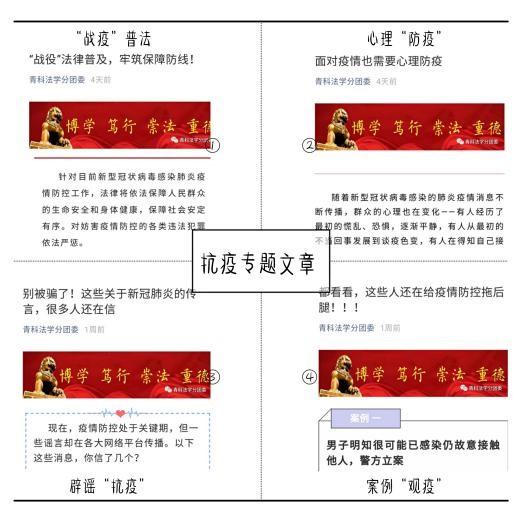 青島新聞網(wǎng) 3月2日訊 2020年,一場(chǎng)新冠肺炎席卷祖國(guó)大地,牽動(dòng)著全國(guó)人民的心。面對(duì)新冠肺炎疫情,青島市慈善益站青島科技大學(xué)法學(xué)院全體師生眾志成城,同心抗疫。自疫情發(fā)生以來,法學(xué)院全體師生一直在行動(dòng),開展了一系列“抗疫”專題工作。