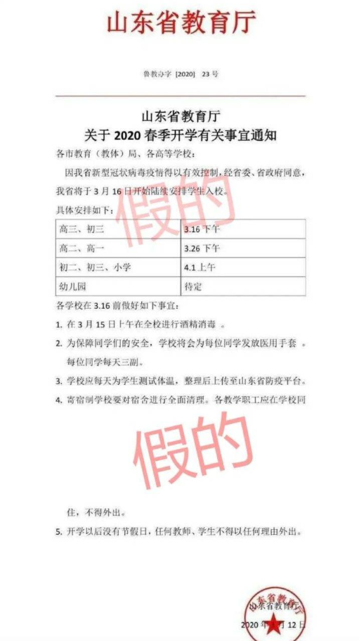 據(jù)山東省教育廳消息,近日網(wǎng)傳“山東省教育廳關于2020春季開學有關事宜通知”系謠言。