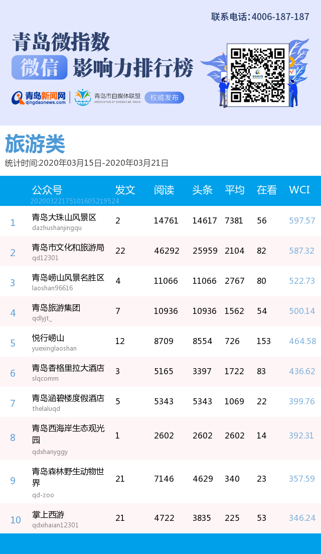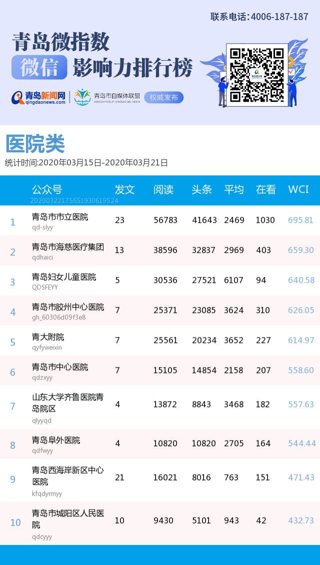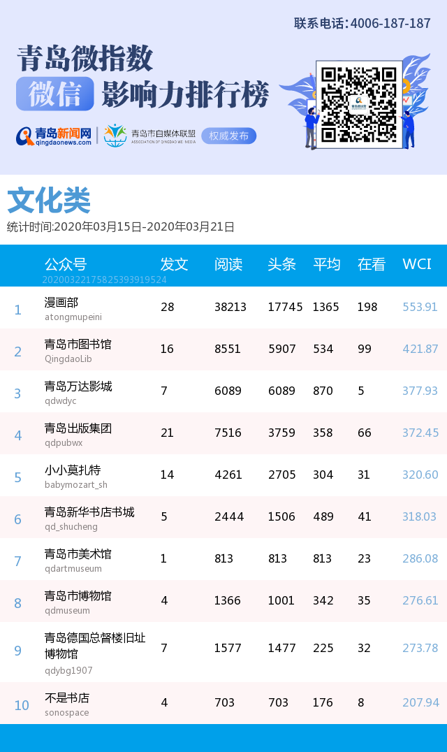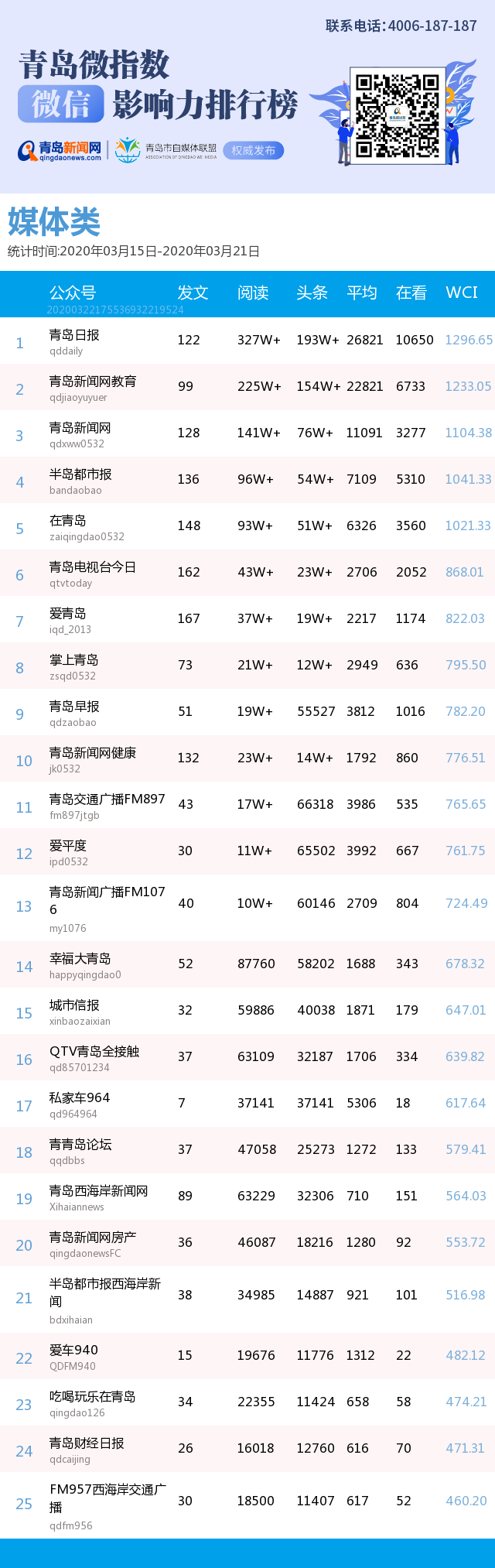 青島新聞網(wǎng)3月23日訊(記者 邢書(shū)玲)由青島新聞網(wǎng)打造的“青島微指數(shù)微信影響力排行榜”今日發(fā)布一周(2020年3月15日-2020年3月21日)榜單。