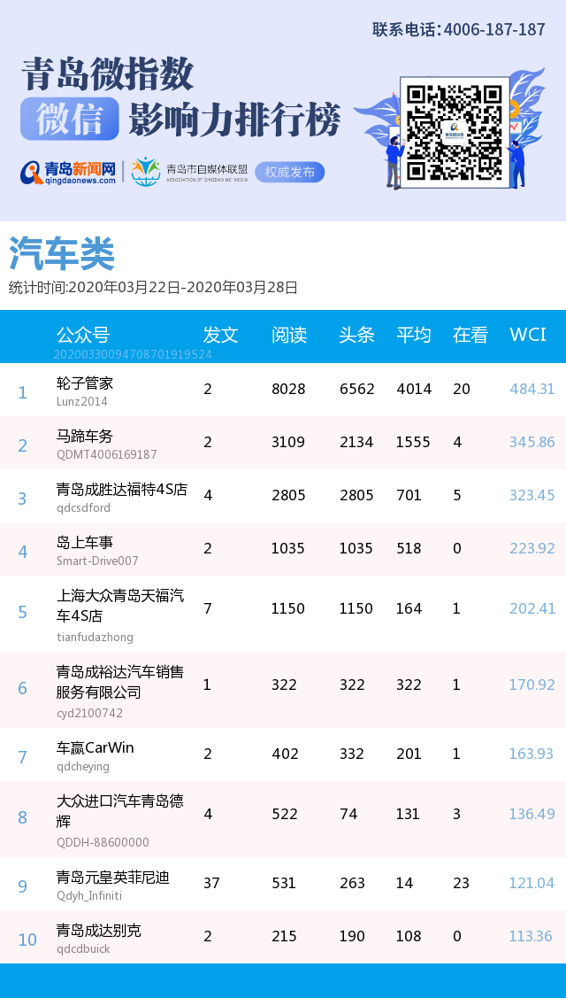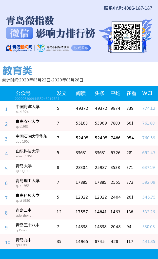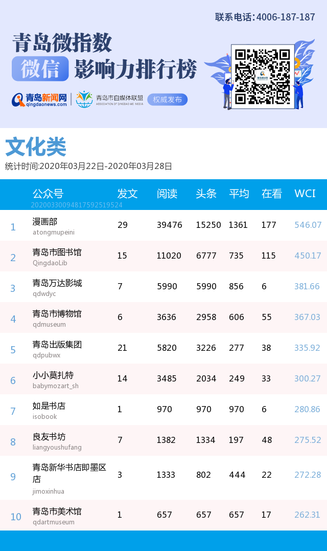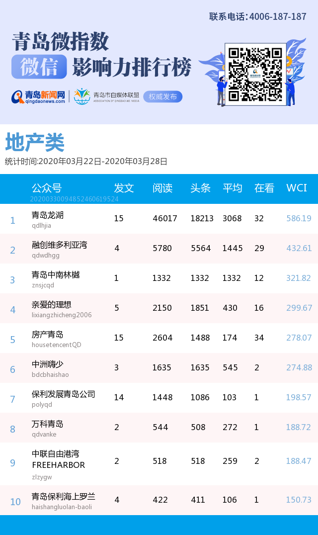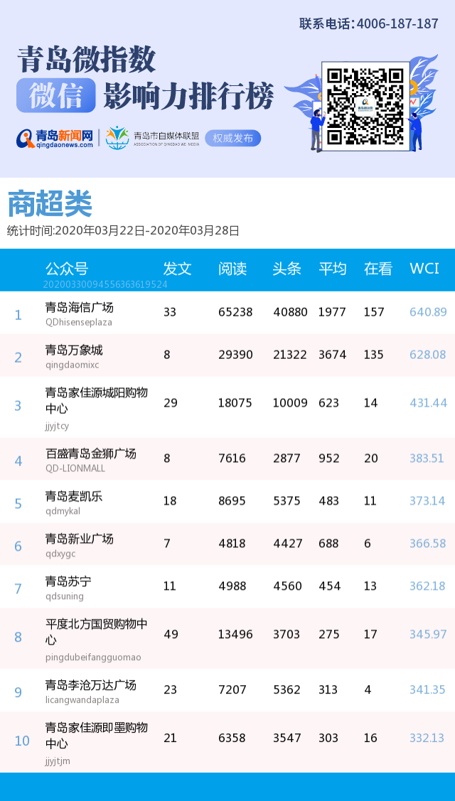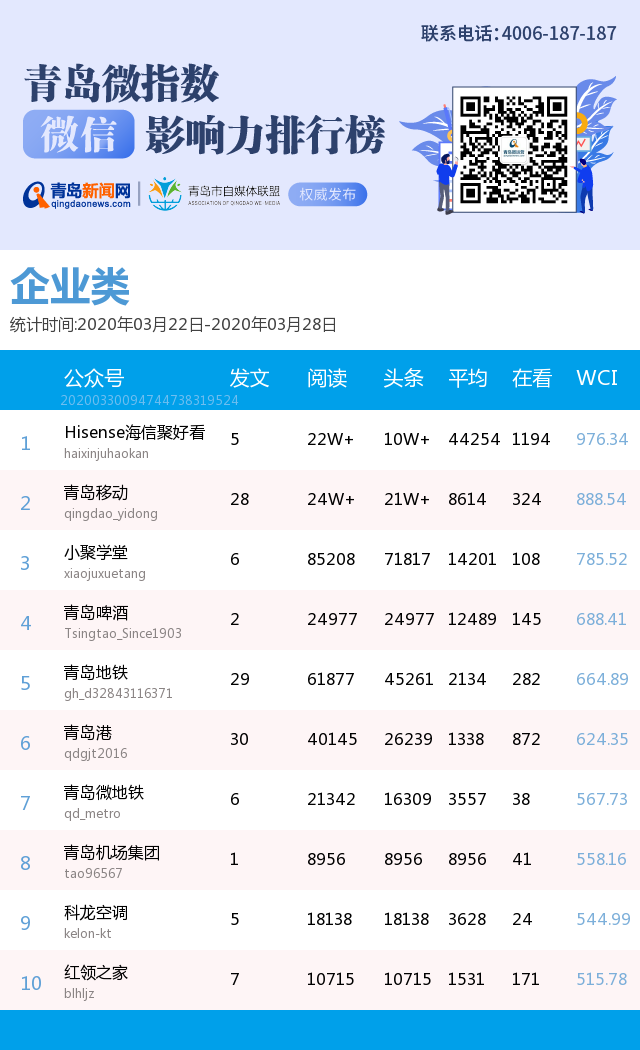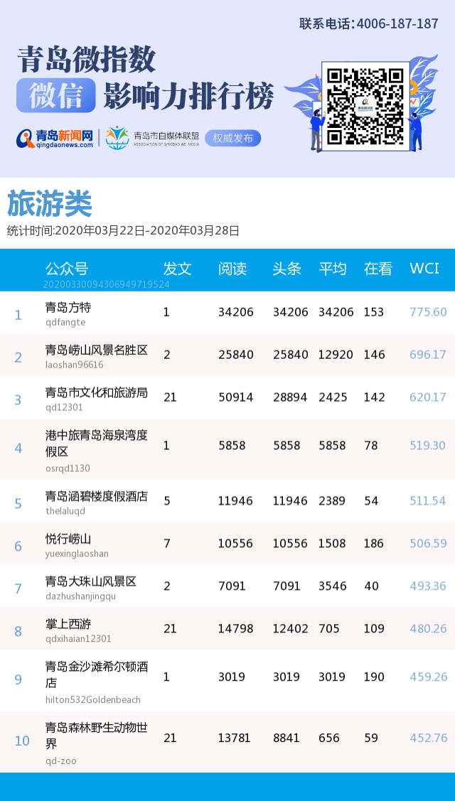 3、本次榜單收錄了青島14個行業(yè)微信公眾號,如您的賬號暫未收錄,可聯(lián)系4006-187-187。