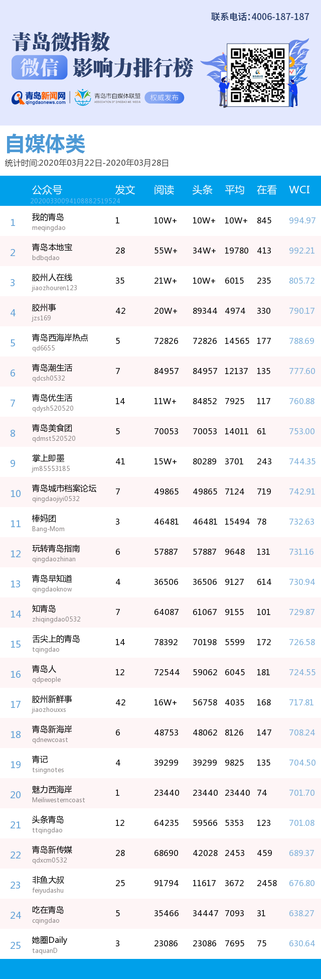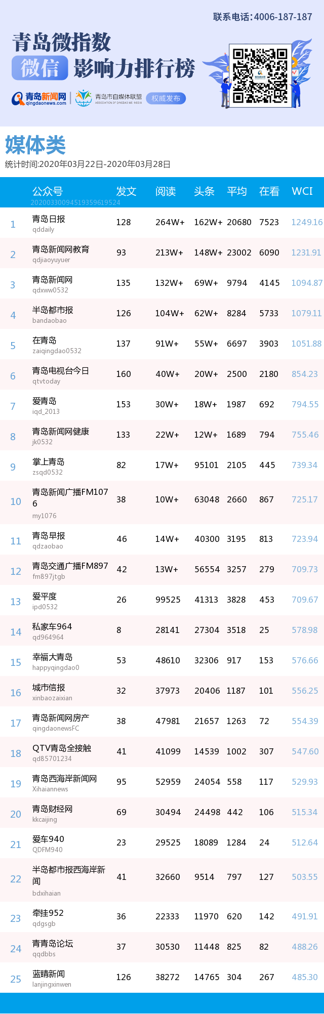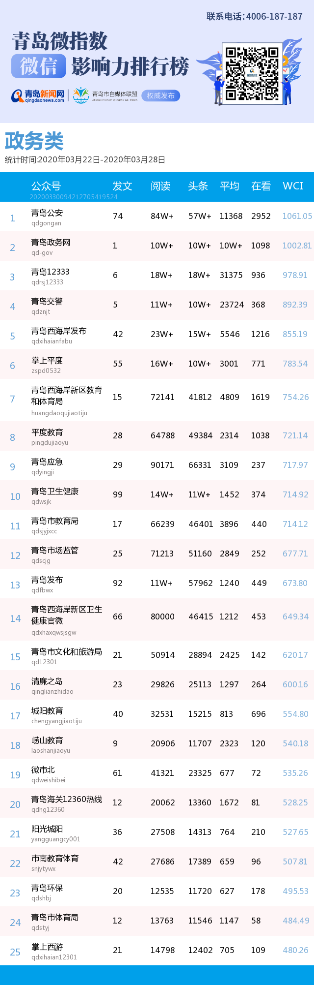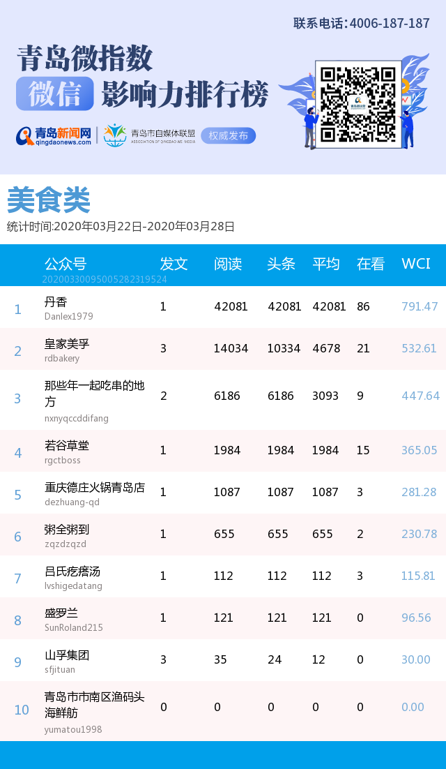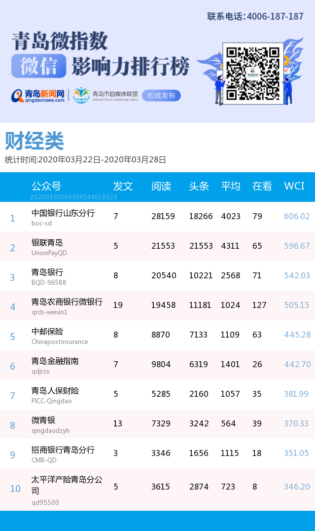 3、本次榜單收錄了青島14個行業(yè)微信公眾號,如您的賬號暫未收錄,可聯(lián)系4006-187-187。