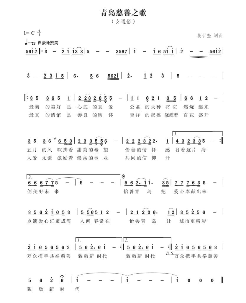 2019年,一首《青島慈善之歌》響徹青島大街小巷,歌曲中洋溢的大愛與慈善精神令人如沐春風(fēng)。此曲由青島市慈善事業(yè)發(fā)展服務(wù)中心精心打造,集中宣傳展示了青島在慈善事業(yè)發(fā)展和促進(jìn)方面的工作與成效,帶有濃厚的“怡善青島”特色。歌詞中,“五月的風(fēng)”是青島的鮮明印記;“甜美的希望”“善良的胸懷”“怡善青島”“大愛無疆”等是島城公益慈善服務(wù)的核心價值;在慈善事業(yè)發(fā)展的路上,我們只要“點滴愛心匯聚成?!?,就可以“萬眾攜手共舉慈善”。