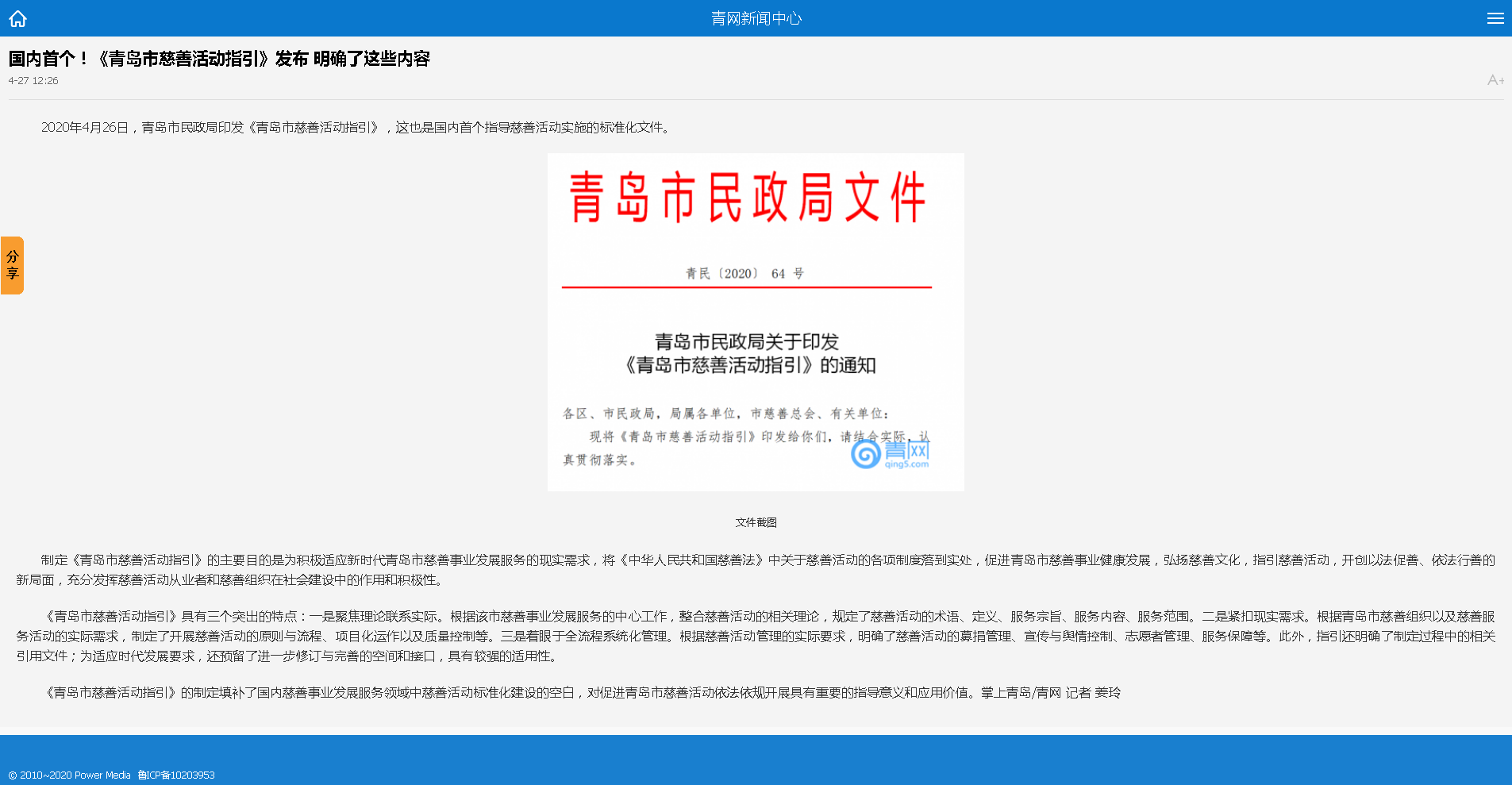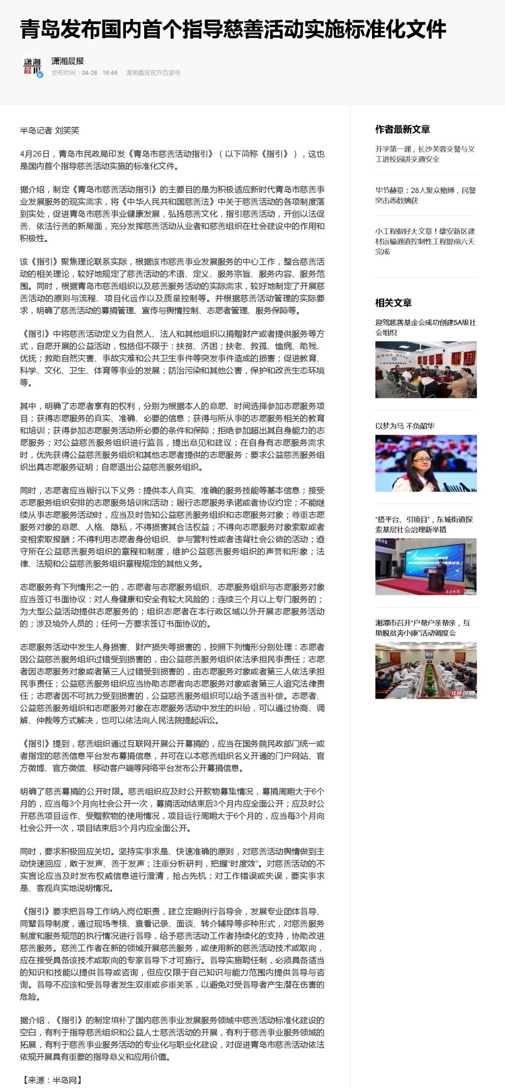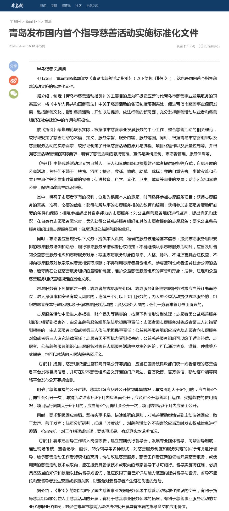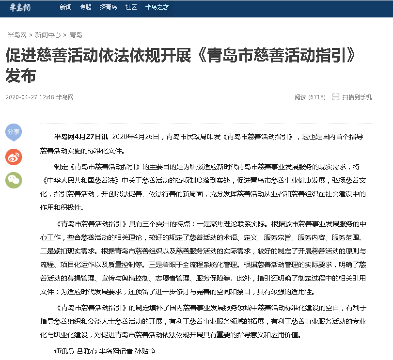 半島網(wǎng):青島發(fā)布國(guó)內(nèi)首個(gè)指導(dǎo)慈善活動(dòng)實(shí)施標(biāo)準(zhǔn)化文件