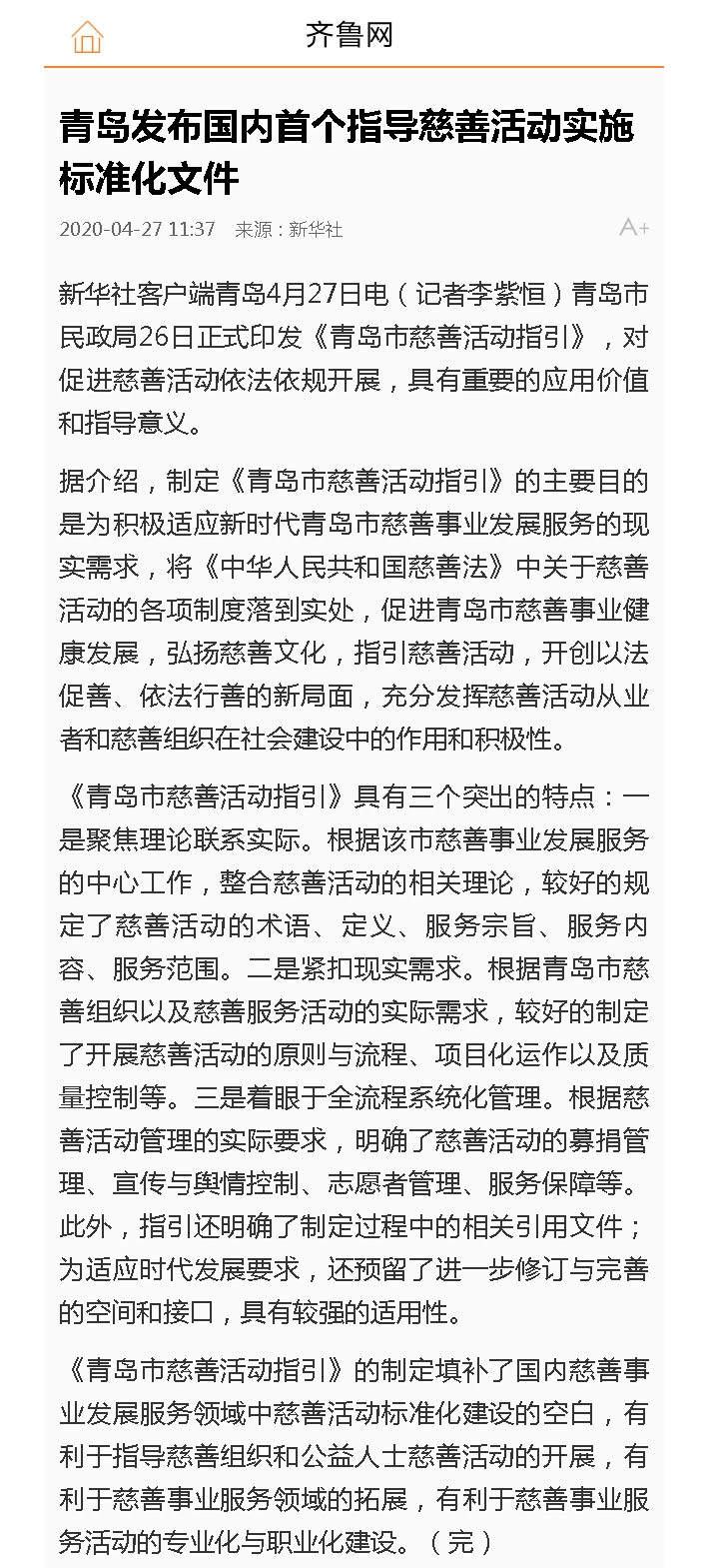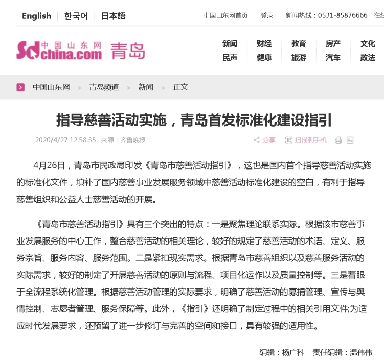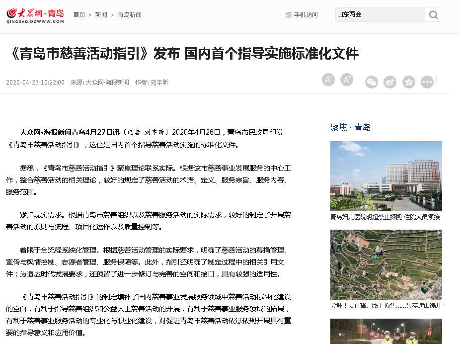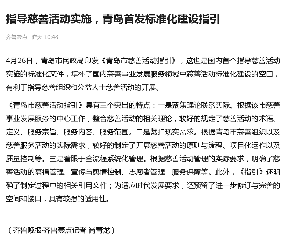 齊魯網(wǎng):青島發(fā)布國(guó)內(nèi)首個(gè)指導(dǎo)慈善活動(dòng)實(shí)施標(biāo)準(zhǔn)化文件