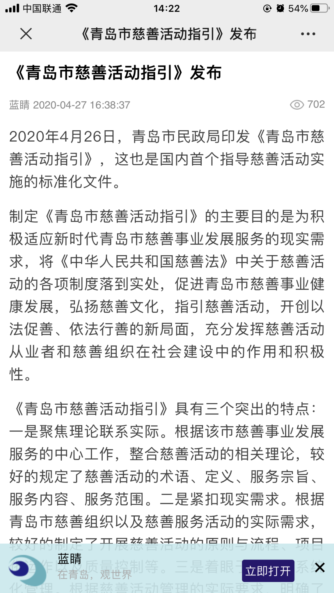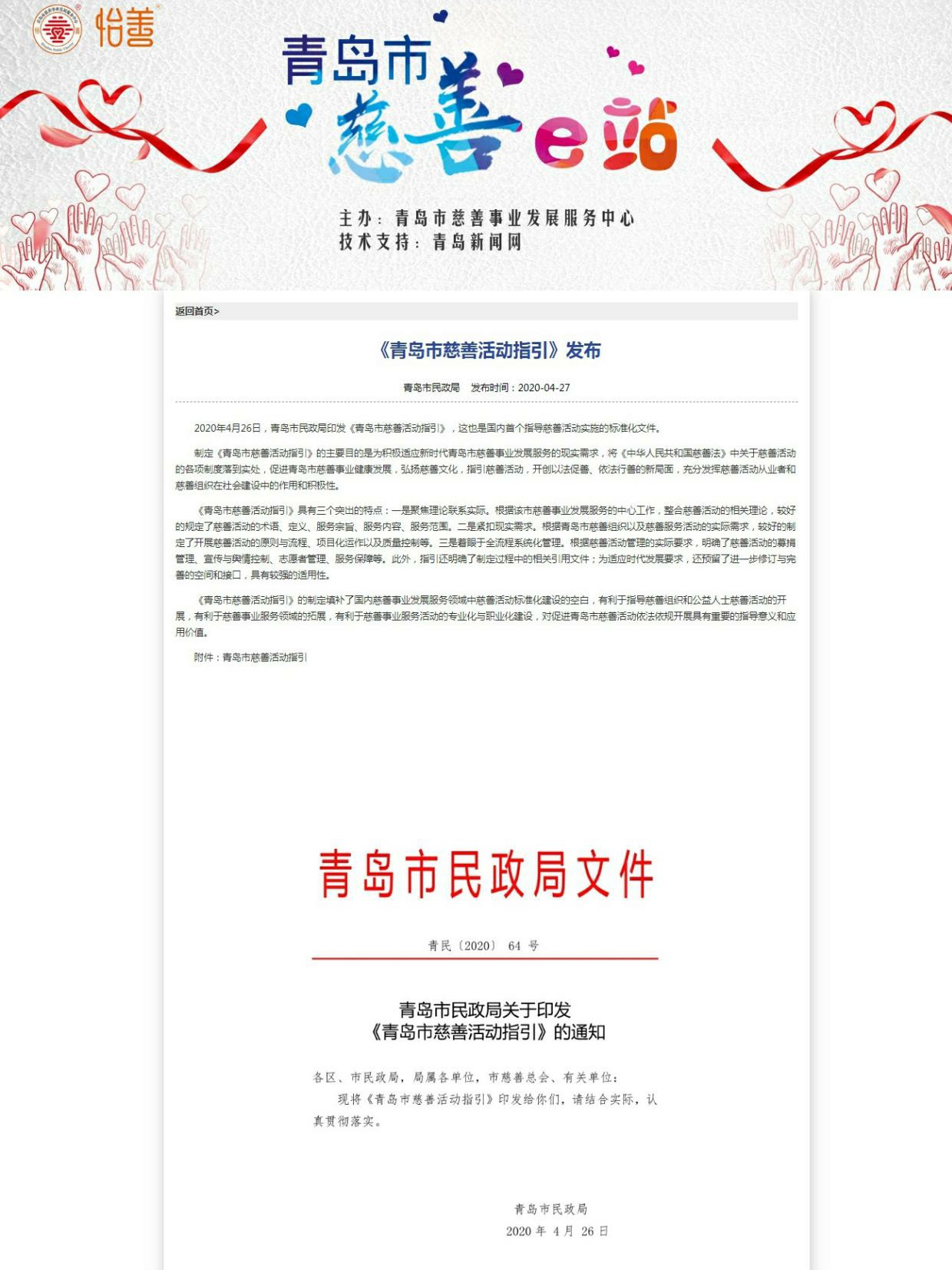 在此,感謝新聞媒體對(duì)《青島市慈善活動(dòng)指引》的關(guān)注,對(duì)青島市慈善事業(yè)的支持!
