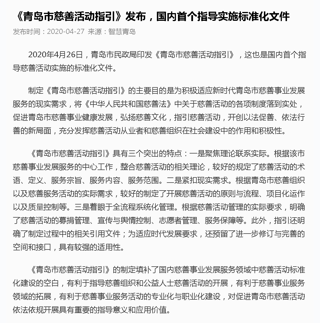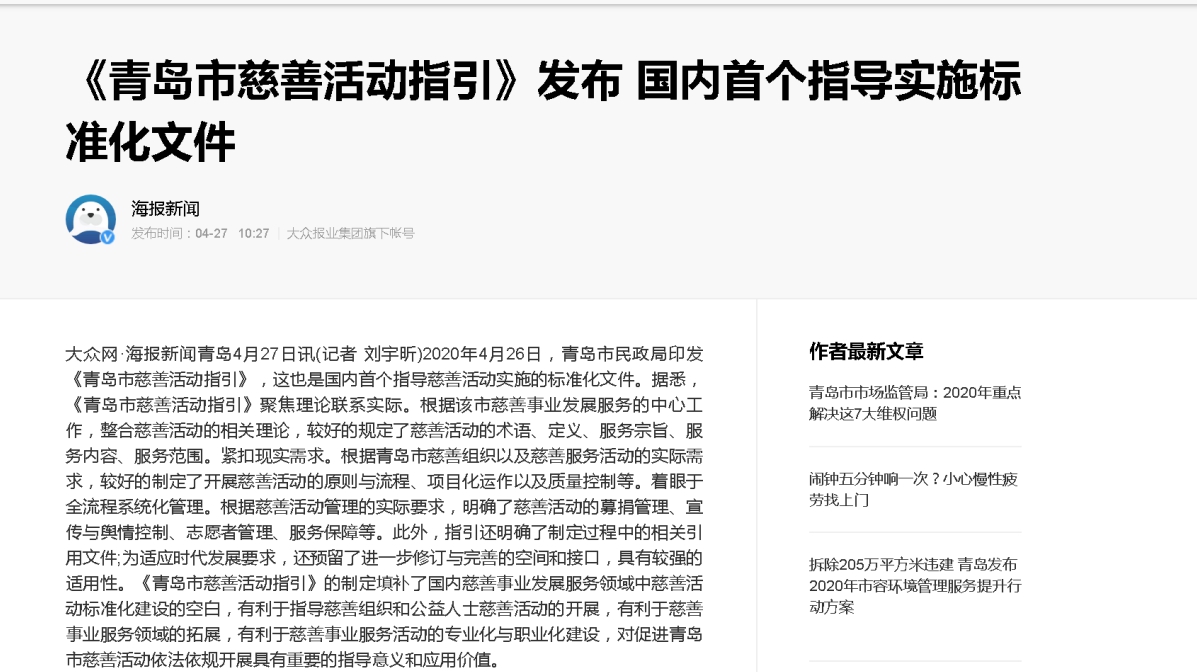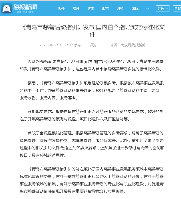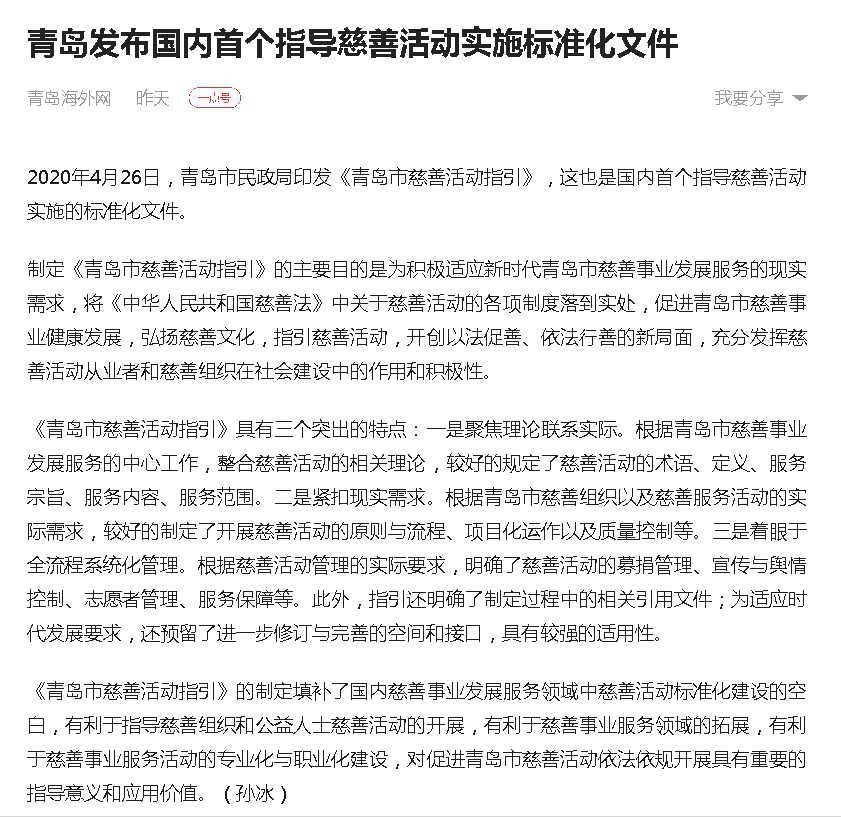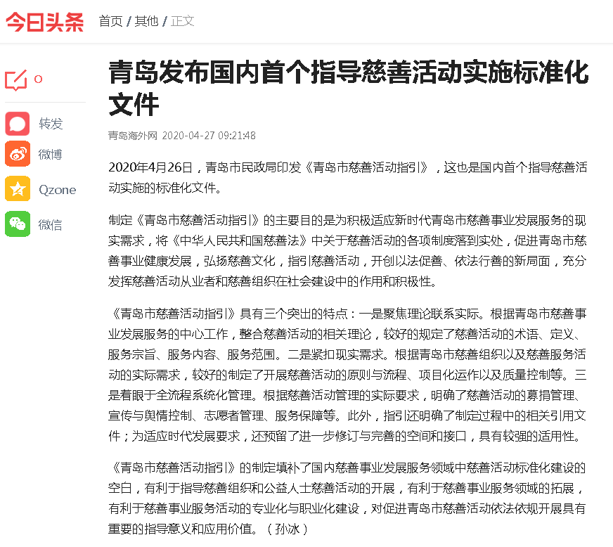青島海外網(wǎng)(今日頭條):青島發(fā)布國(guó)內(nèi)首個(gè)指導(dǎo)慈善活動(dòng)實(shí)施標(biāo)準(zhǔn)化文件