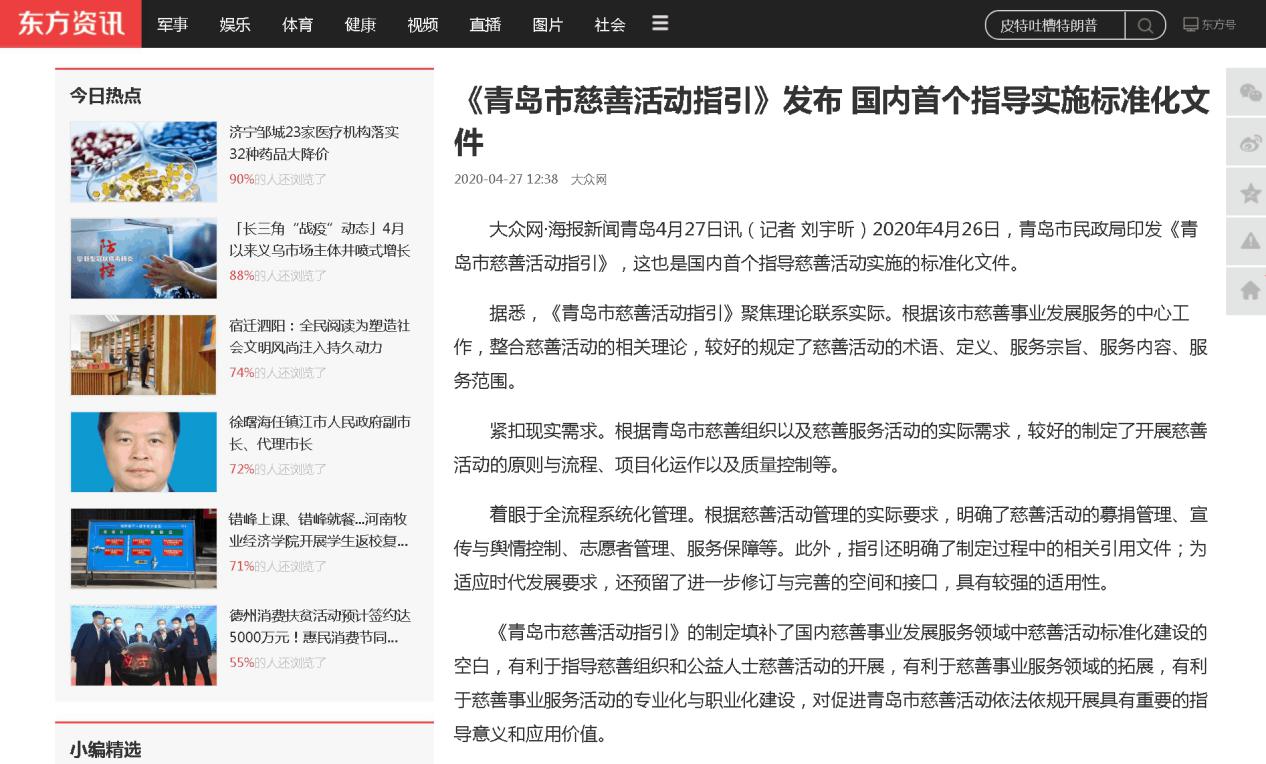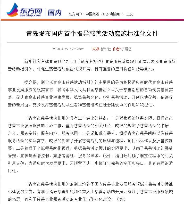 東方網(wǎng):青島發(fā)布國(guó)內(nèi)首個(gè)指導(dǎo)慈善活動(dòng)實(shí)施標(biāo)準(zhǔn)化文件