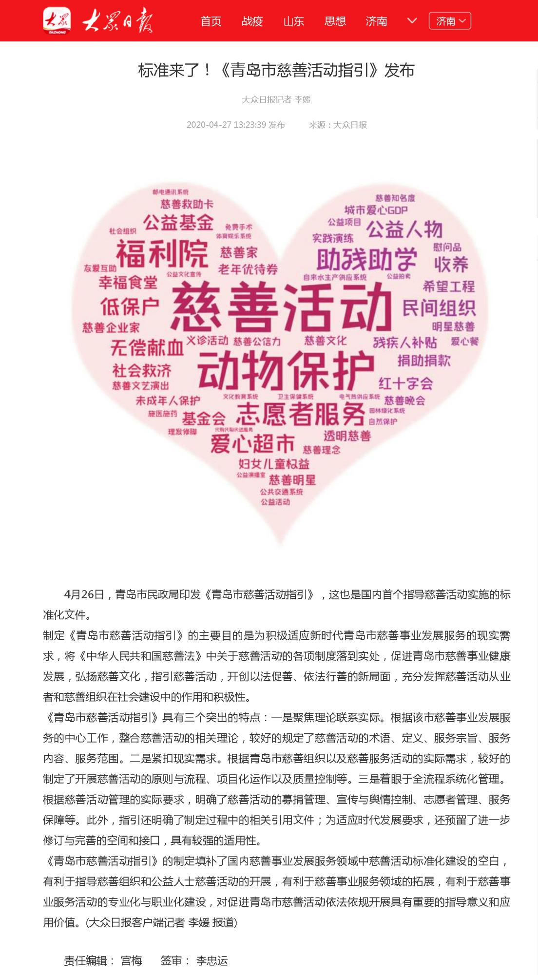 大眾日?qǐng)?bào):標(biāo)準(zhǔn)來(lái)了!《青島市慈善活動(dòng)指引》發(fā)布
