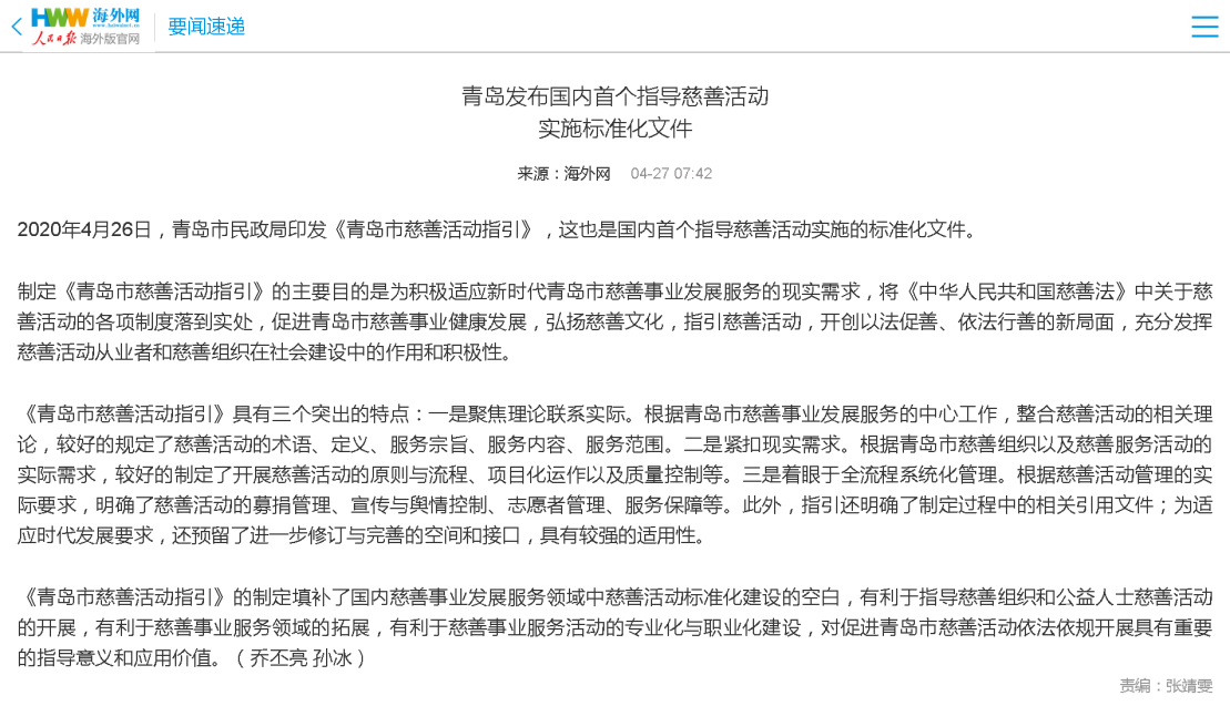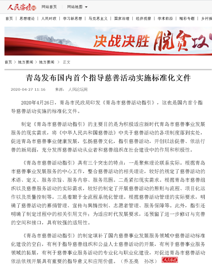 人民日?qǐng)?bào)海外網(wǎng):青島發(fā)布國(guó)內(nèi)首個(gè)指導(dǎo)慈善活動(dòng)實(shí)施標(biāo)準(zhǔn)化文件