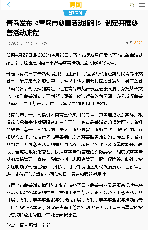 信網(wǎng):青島發(fā)布《青島市慈善活動(dòng)指引》制定開(kāi)展慈善活動(dòng)流程